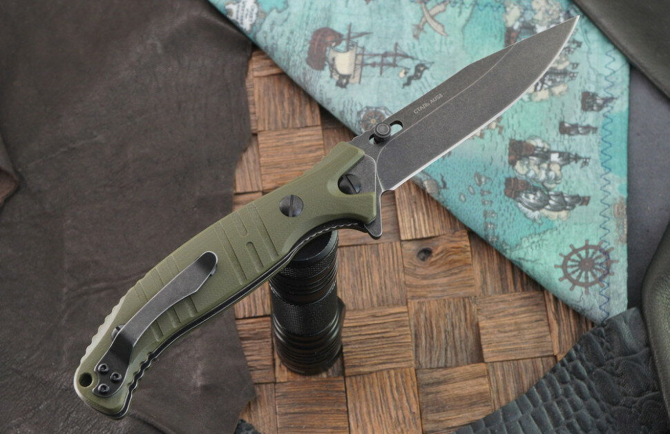 Стеклотекстолит на рукояти — надёжно. Однорукое открывание за флиппер и шпенёк. Шпенёк съёмный и смещаемый. Лайнер — крайне неприхотливый замок, снижает цену в том числе. Неприхотливая Aus-8 |