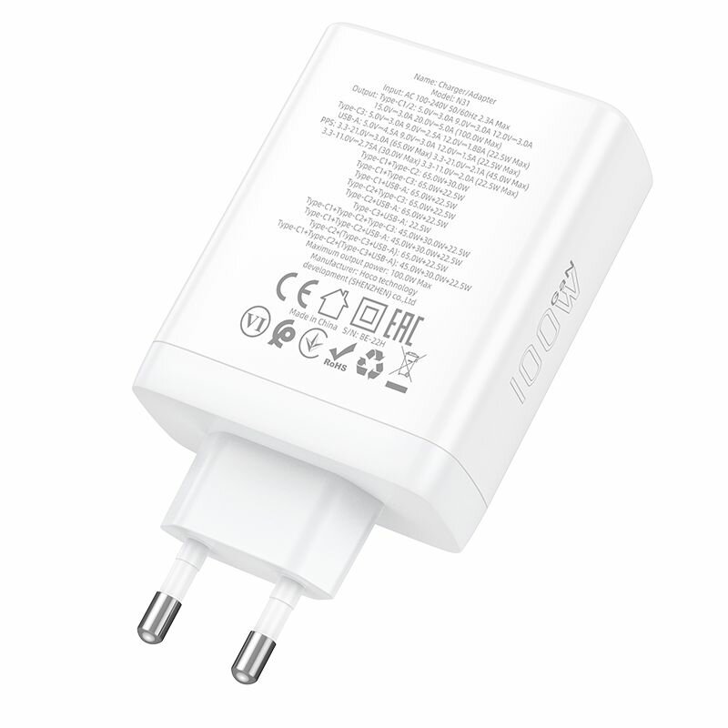 Сетевое зарядное устройство Hoco N31 USB + 3 Type-C, GAN PD 100W, QC 3.0, белый