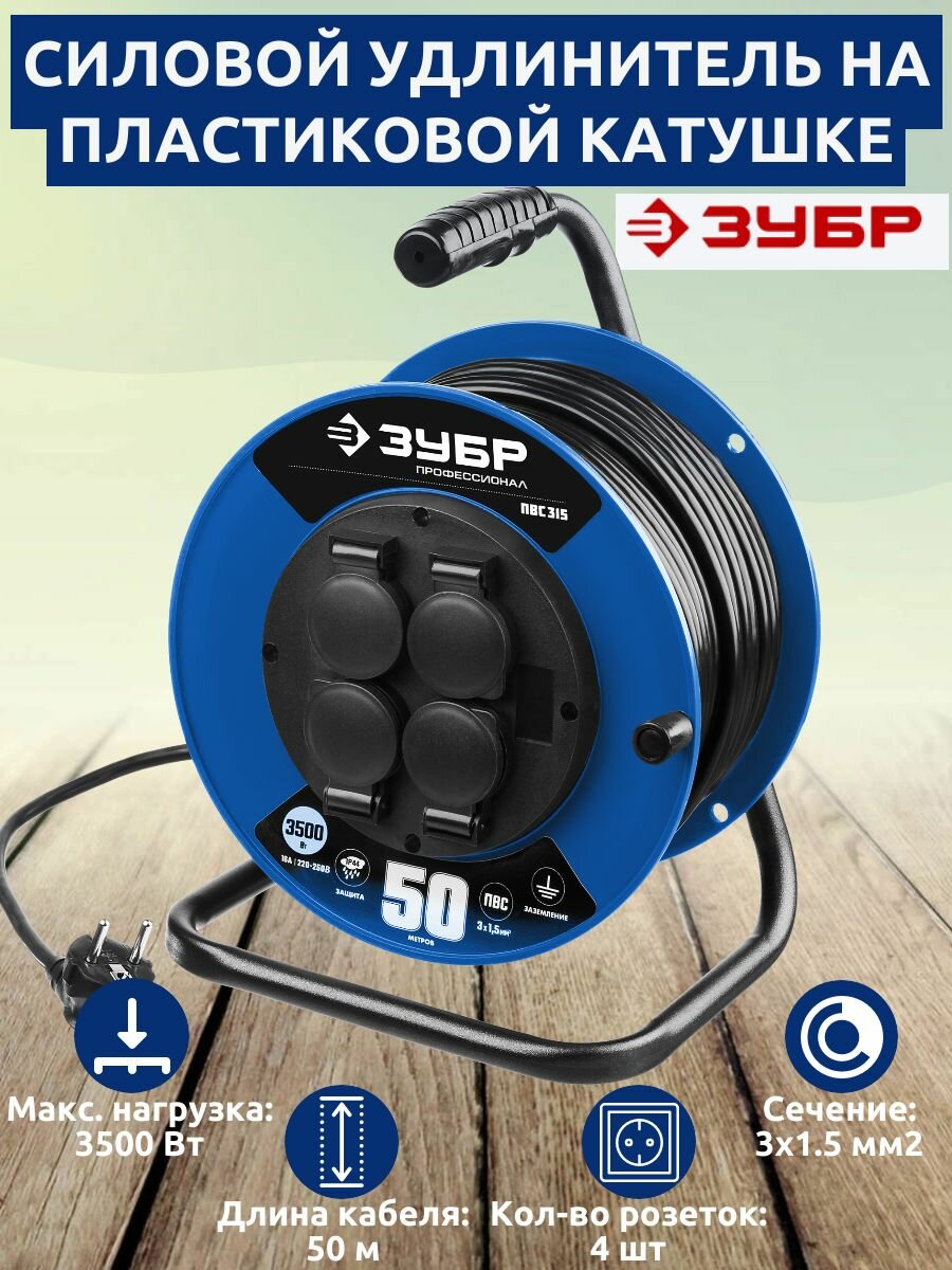 ЗУБР ПВС 315, ПВС, 3 x 1.5 мм2, 50 м, 3500 Вт, IP44, силовой удлинитель на катушке, Профессионал (55081-50)