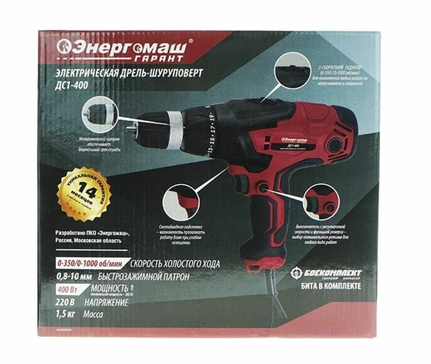ДС1-400 Дрель-шуруповерт 400Вт,сеть,реверс,подсветка,бита PH2*75мм в комплекте,Энергомаш Гарант