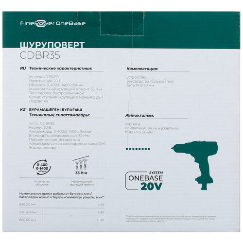 Дрель-шуруповерт FinePower CDBR35 OneBase20 , Без ЗУ, Без АКБ