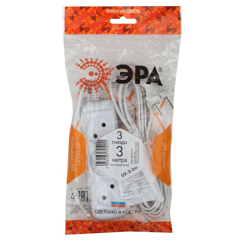 Удлинитель ЭРА UX33m без заземления 1300Вт, 3 гнезда, 3м Б0035748