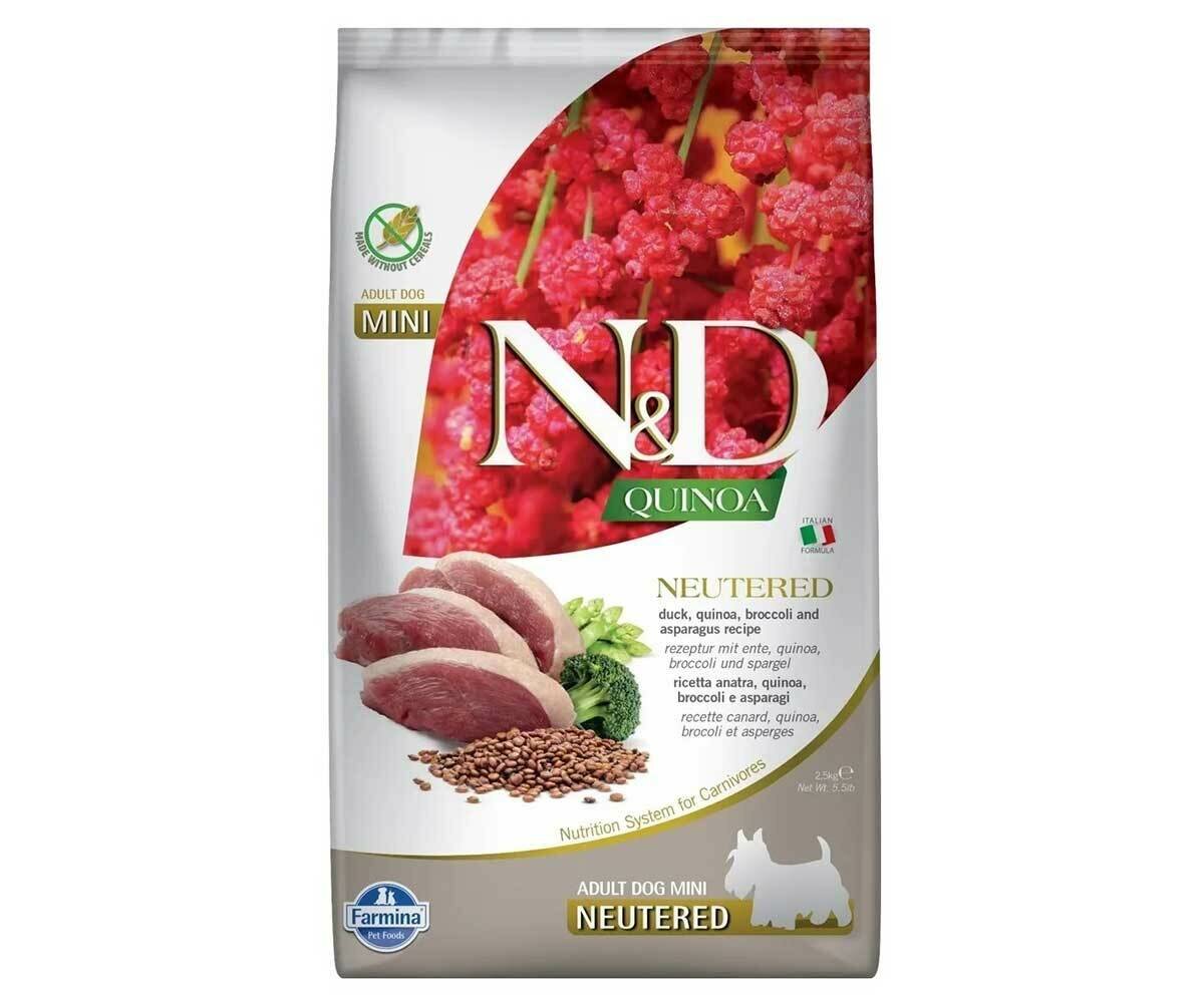 Farmina N D GF QUINOA DUCK, BROCCOLI ASPARAGUS NEUTERED ADULT д/c MINI утка и киноа для стерилизованных и кастрированных собак 2,5 кг новинка, (1 шт)