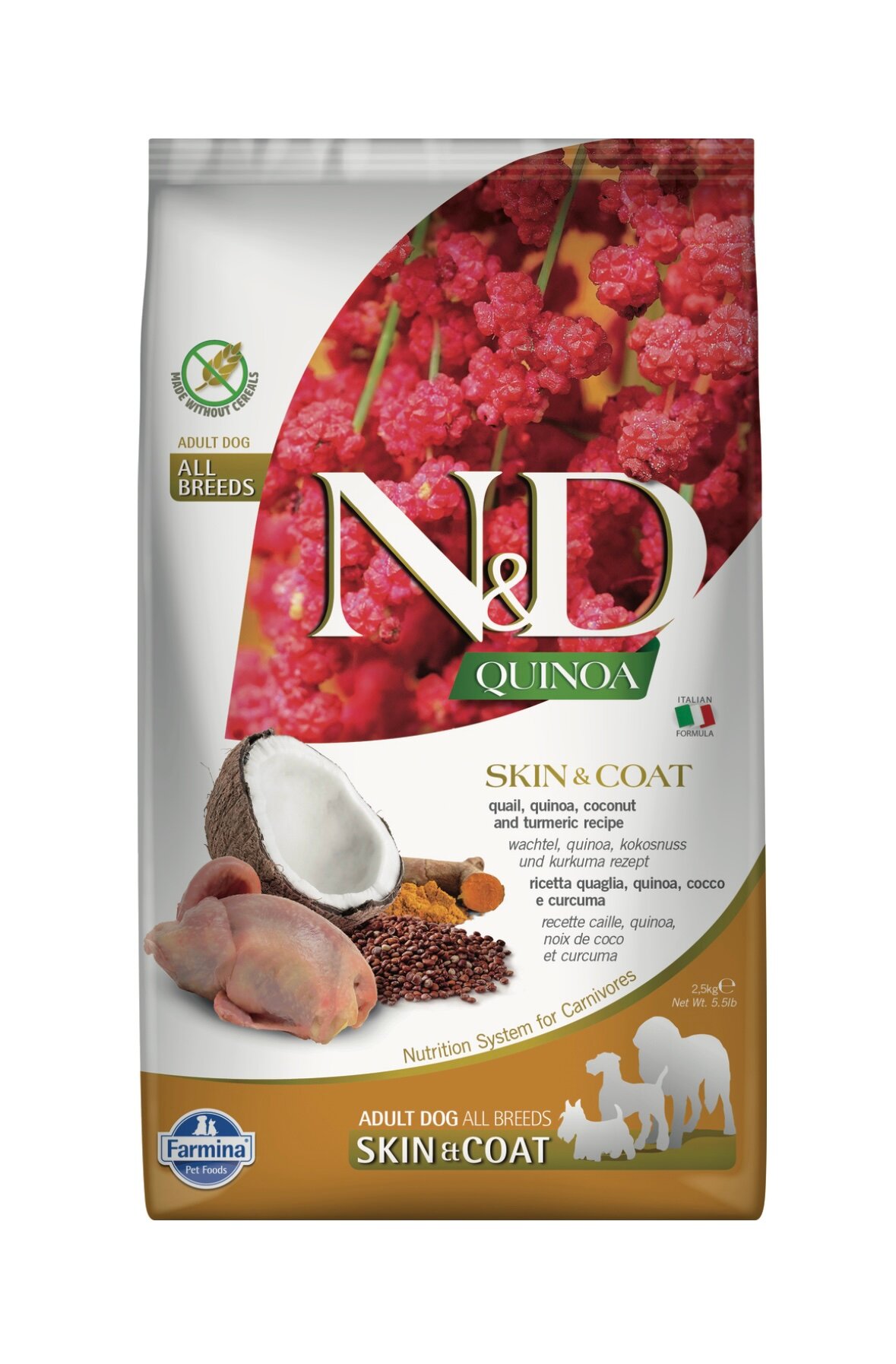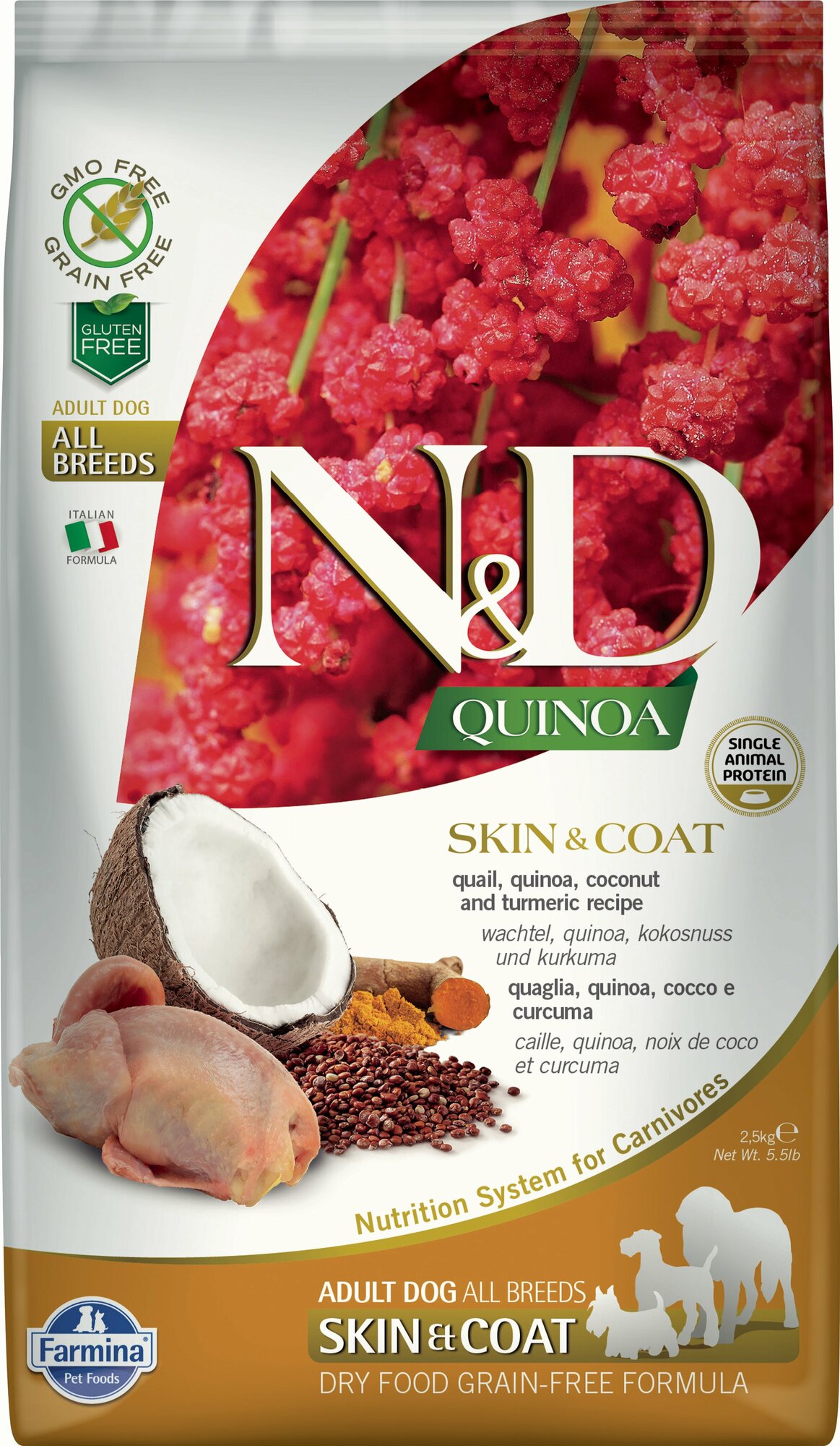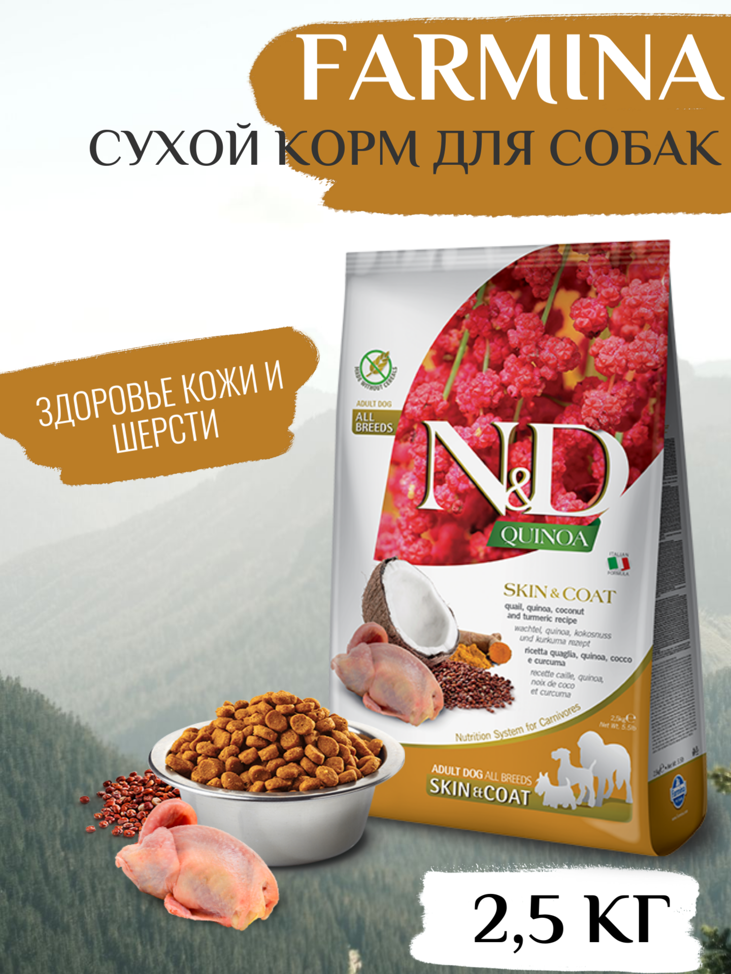 Сухой корм FARMINA DOG N&D GRAIN FREE QUINOA SKIN & COAT QUAIL беззерновой для взрослых собак всех пород при аллергии с перепелом и киноа (2,5 кг)