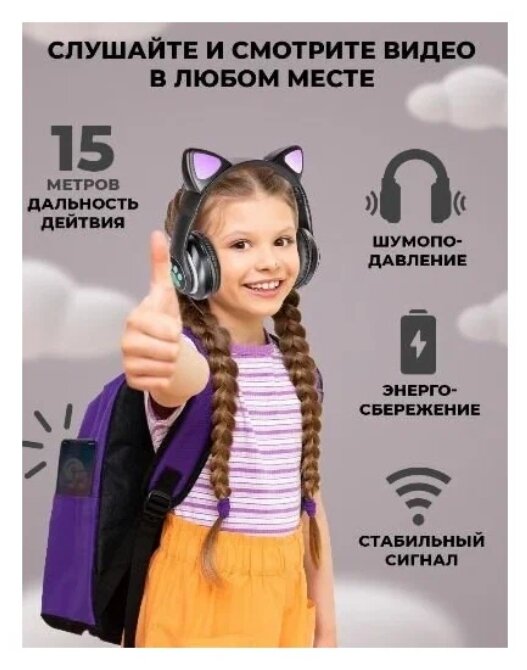 Светящиеся детские беспроводные наушники с ушками / Беспроводные наушники детские / Наушники с ушами / Сиреневый