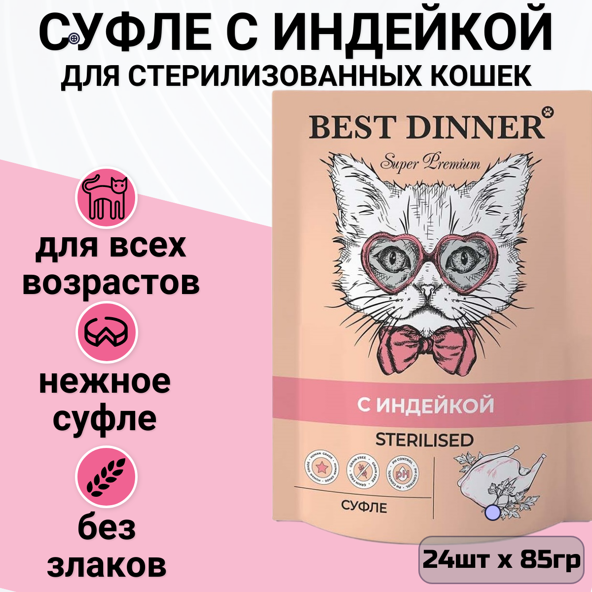 BEST DINNER мясные деликатесы STERILISED для кастрированных котов и стерилизованных кошек суфле с индейкой (85 гр х 24 шт)