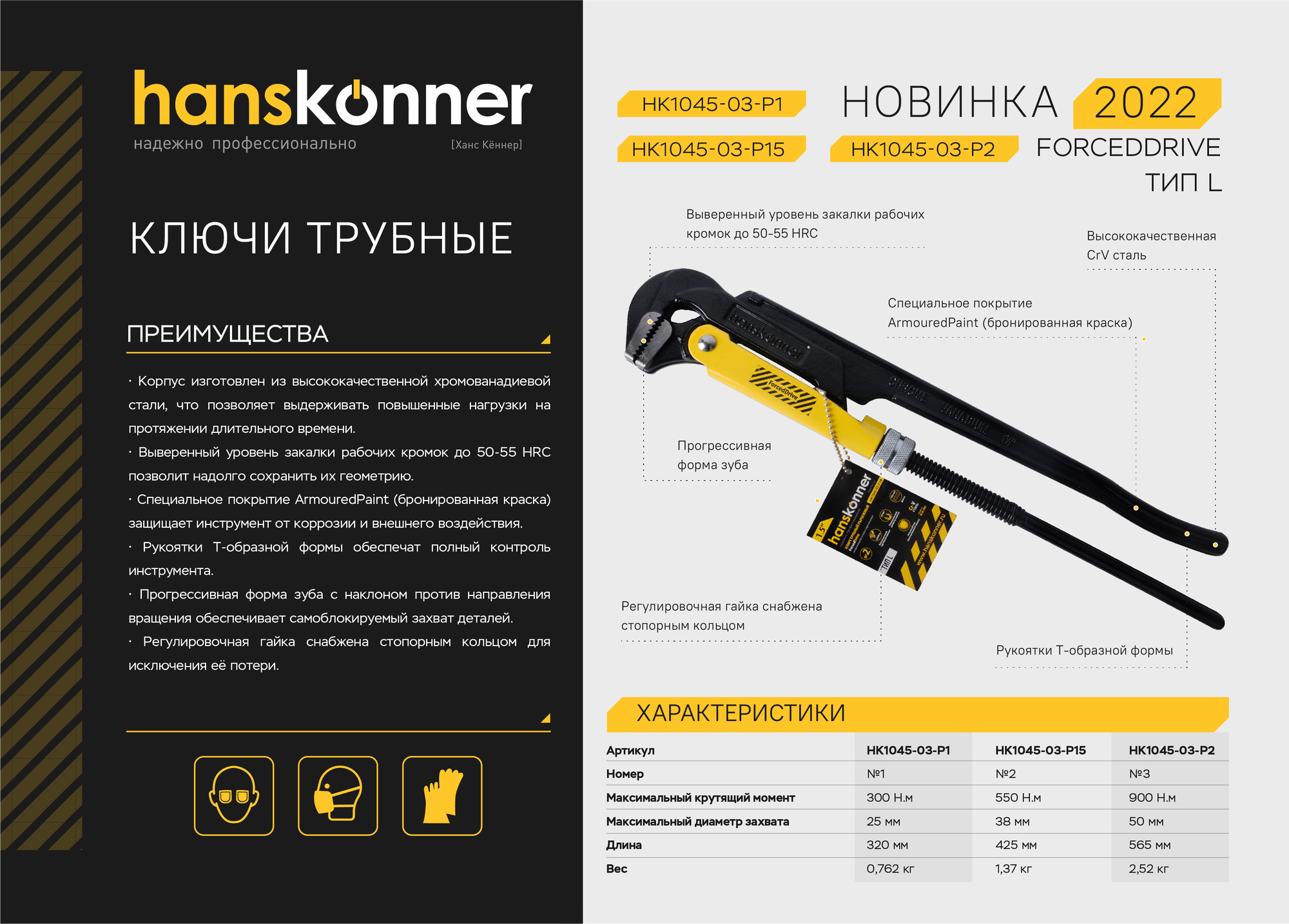 Ключ трубный рычажный 1,5&quot, №2, 425мм, Тип L (90°), CrV сталь, Hanskonner интересное: