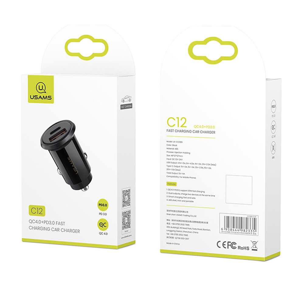 Купить Автомобильное зарядное устройство USAMS USB+Type-C (модель US-CC086 C12), QC4.0+PD3.0 Fast Charging черный (CC86TC01)