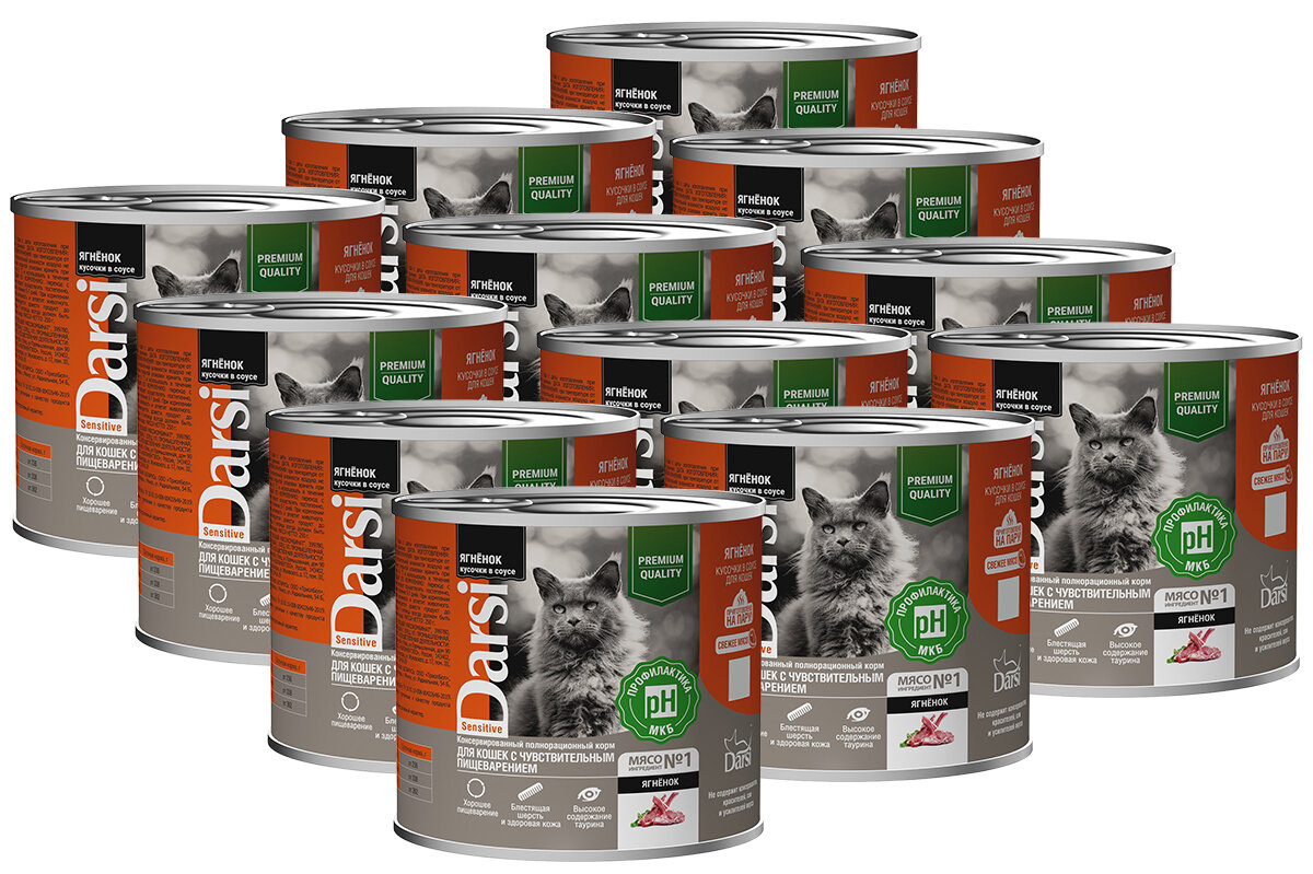 Влажный корм для кошек Darsi при чувствительном пищеварении, с ягненком 12 шт. х 250 г (кусочки в соусе)
