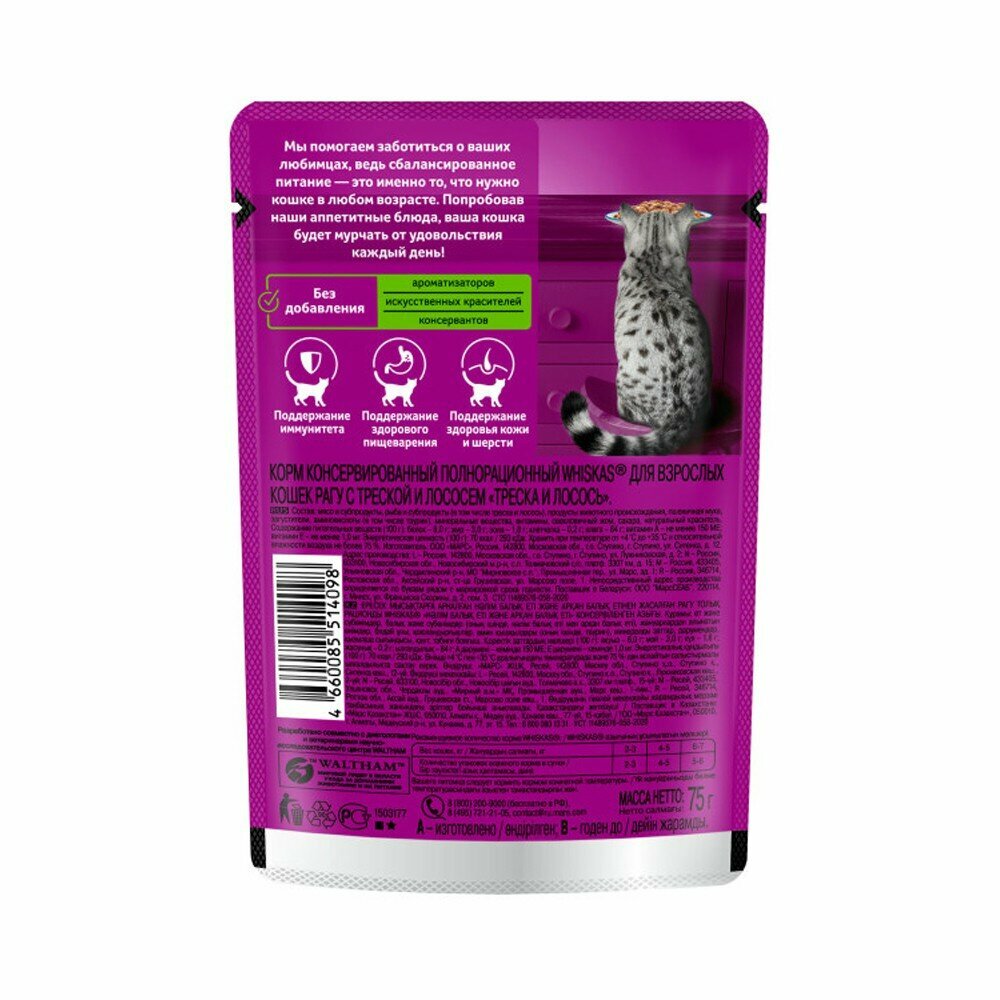 Whiskas пауч для кошек (рагу) Треска и лосось, 75 г. упаковка 28 шт