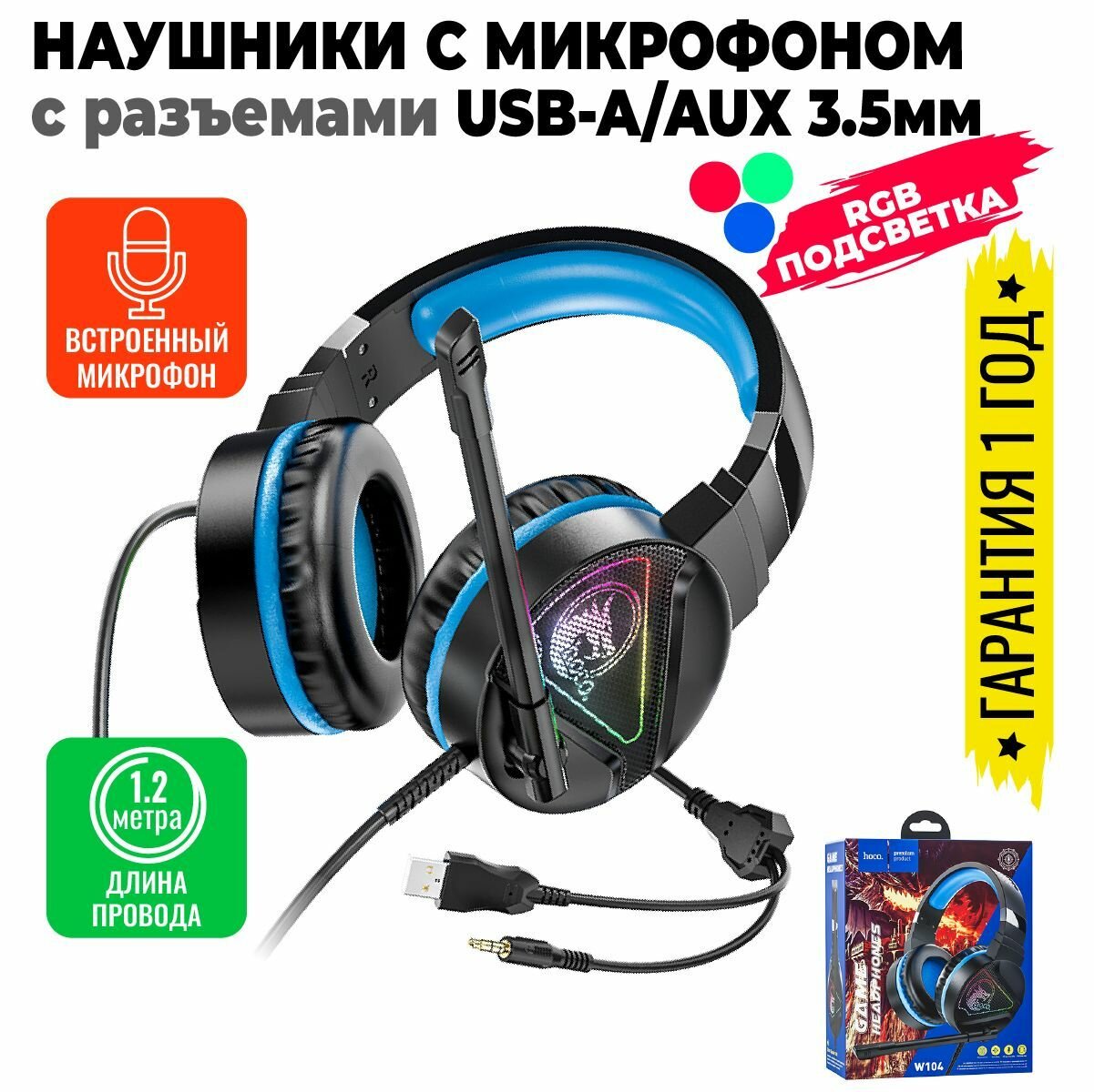 Наушники геймерские проводные aux 3.5 мм USB полноразмерные накладные с микрофоном, светящиеся Hoco W104 для Apple iPhone, Android, ПК, ноутбука