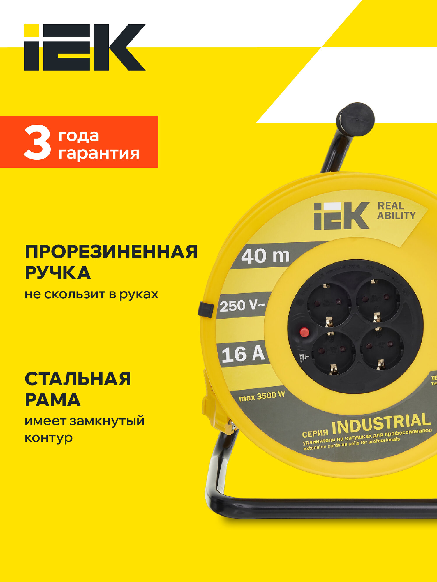 Удлинитель на катушке IEK Industrial УК40, 4 розетки, с т/з, с заземлением, 3 x 1,5 мм², 40 м