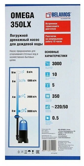 Насос дренажный Belamos Omega 350 LX, 50 л/мин, Н-10 м, каб.6 м