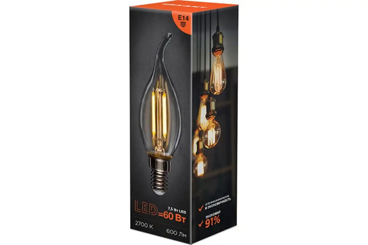 Лампа филаментная Rexant Свеча на ветру CN37, 7,5 Вт, 2700 К, Е14, теплый свет