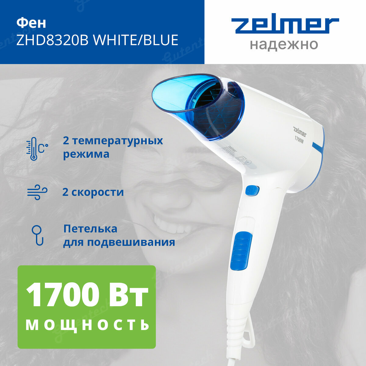 Фен ZELMER ZHD8320B белый/голубой интересное: