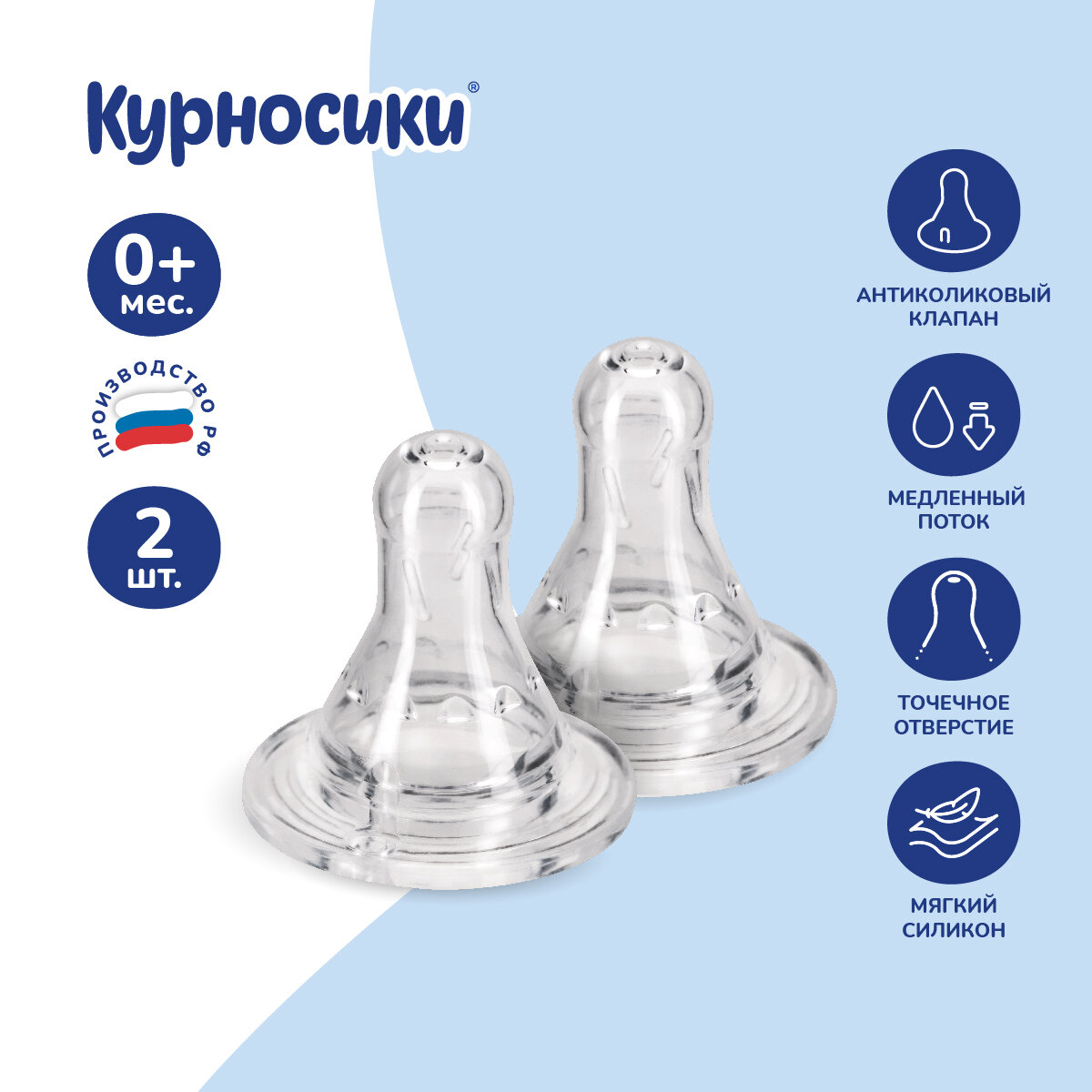 Соска для бутылочки силиконовая Курносики классическая, медленный поток, 0+ мес., 2 шт.