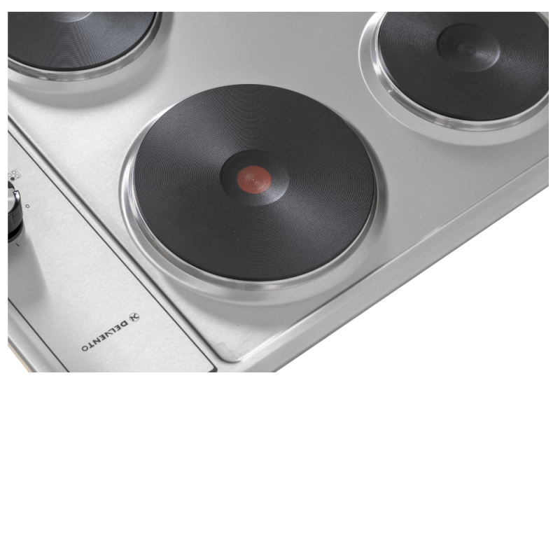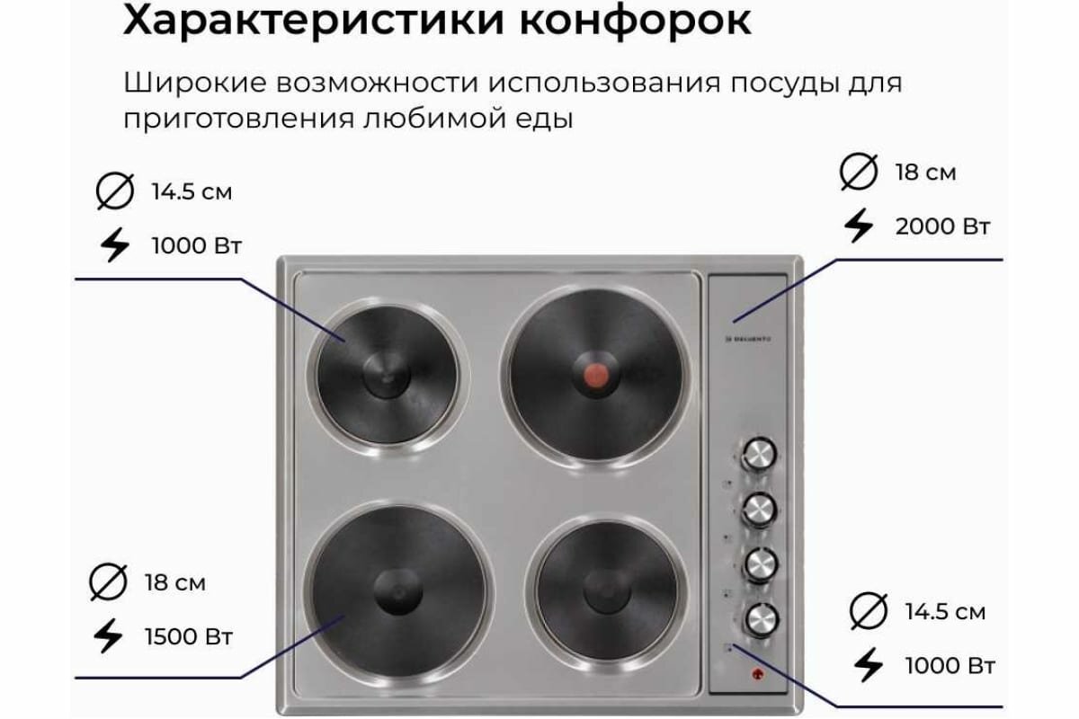 Варочная панель электрическая DELVENTO V60E04M001 / 60 см / 4 конфорки (2 с быстрым нагревом Fast Heating System) / 5500 Вт / боковая панель управления / цвет серебристый / нержавеющая сталь / 3 года гарантии