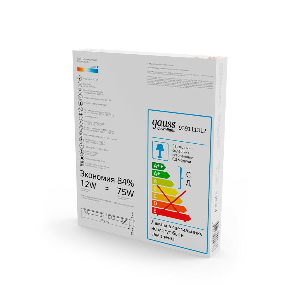 Встраиваемый светильник Gauss ультратонкий круглый IP20 12W,170х22, 155, 6500K 990лм 1/20