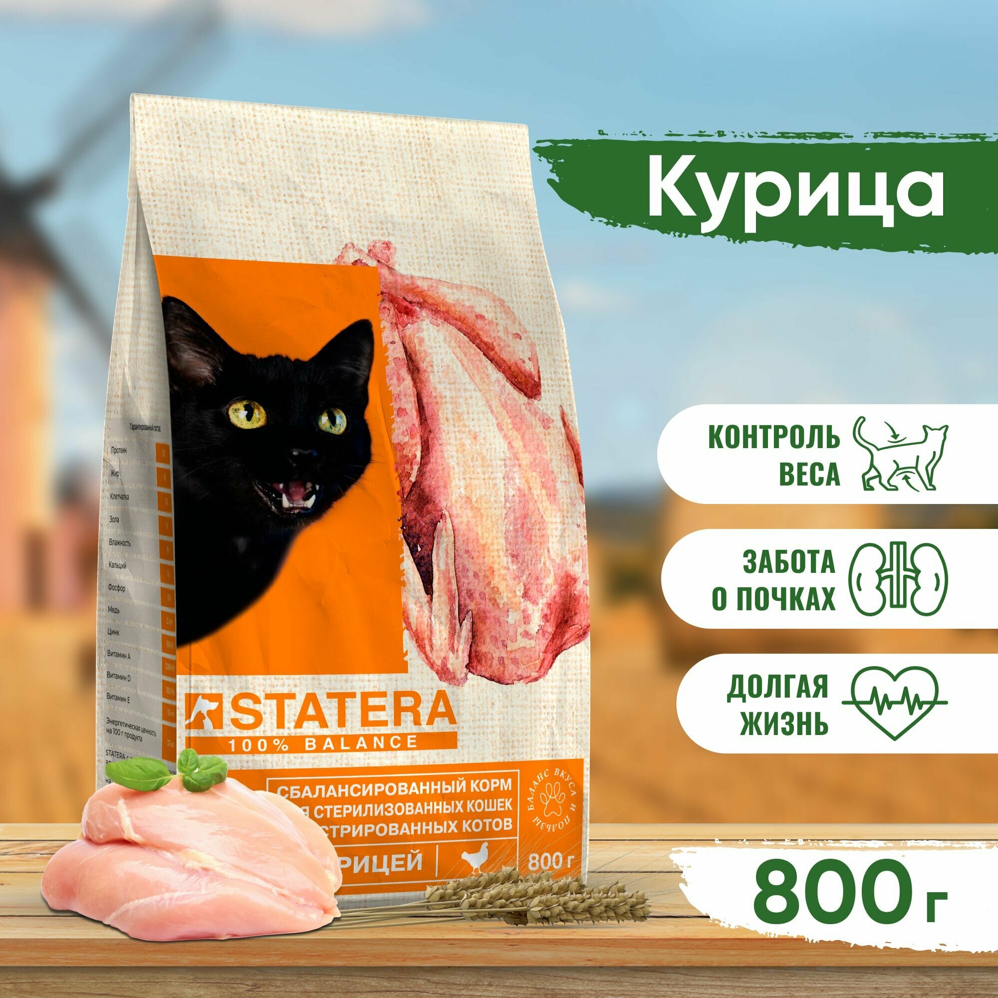 STATERA Сухой корм для стерилизованных кошек и кастрированных котов, курица 800 гр