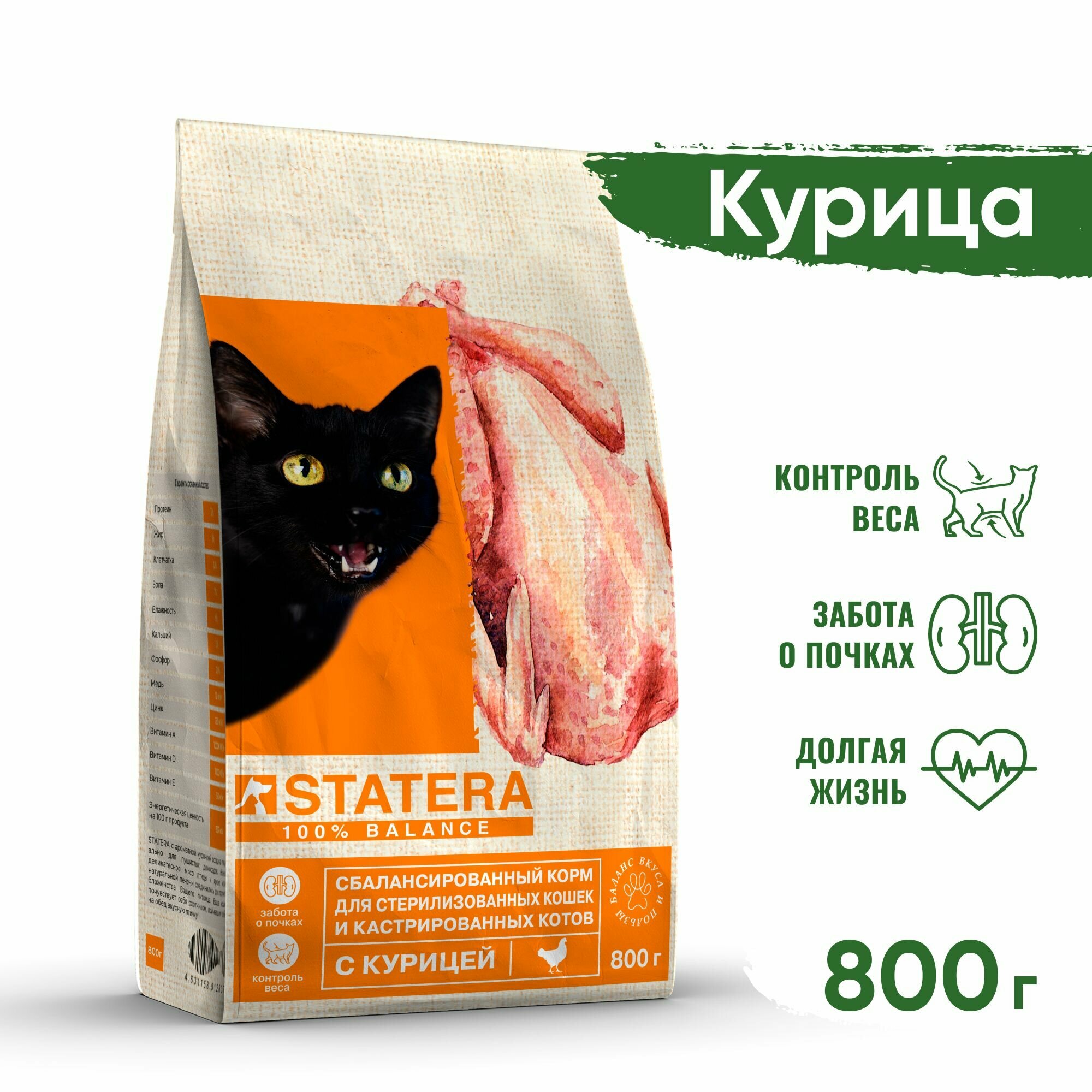 Statera сухой сбалансированный корм для взрослых стерилизованных кошек и кастрированных котов с курицей - 800 г