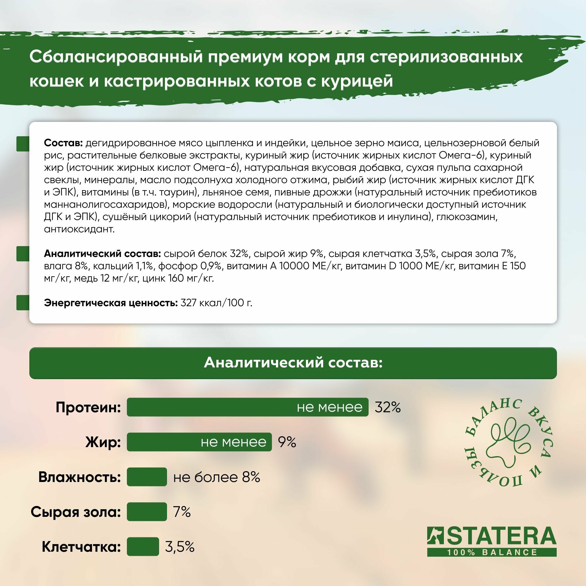 Сухой Премиум корм для стерилизованных кошек и кастрированных котов STATERA с курицей 3кг/Cтатера.