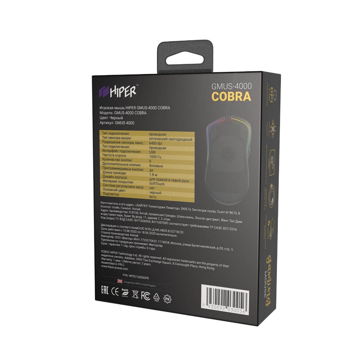 Мышь игровая HIPER COBRA (GMUS-4000) Black USB (6400 dpi, 6 кнопок, USB кабель 1.8м, черный)