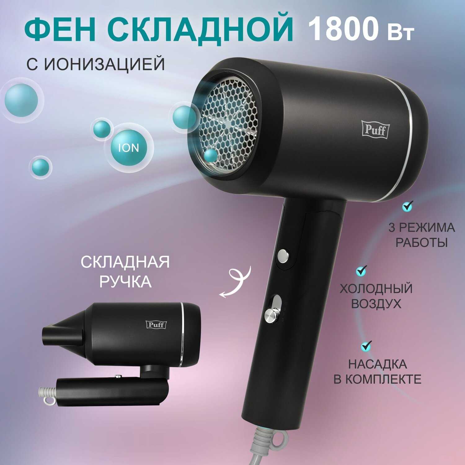 Фен для волос Puff-1801 Вlack, черный, 1,8 кВт, Арт: 1405.015