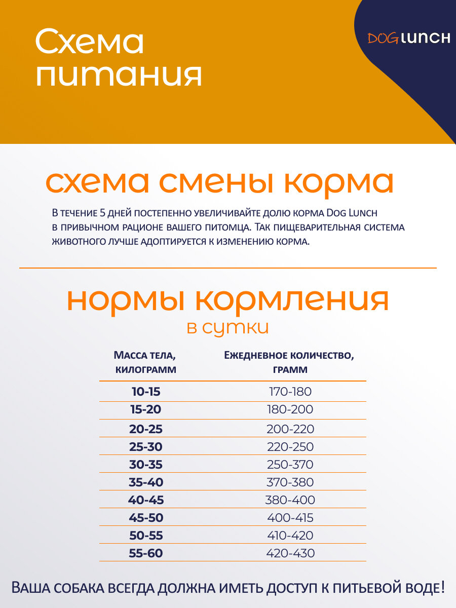 | Дополнительная информация | Органолептические свойства: Светло-коричневая гранулы диаметром 12 мм. Переход с предыдущего рациона следует осуществлять постепенно, небольшими порциями в течение 5-7 дней. Если вы уже используете любой из сухих кормов Dog Lunch, то можно безопасно чередовать вкусы в рамках возрастной линейки без переходного периода. При кормлении необходимо учитывать активность, возраст размер и индивидуальные особенности Вашего питомца. У питомца всегда должен быть доступ к свежей питьевой воде. |