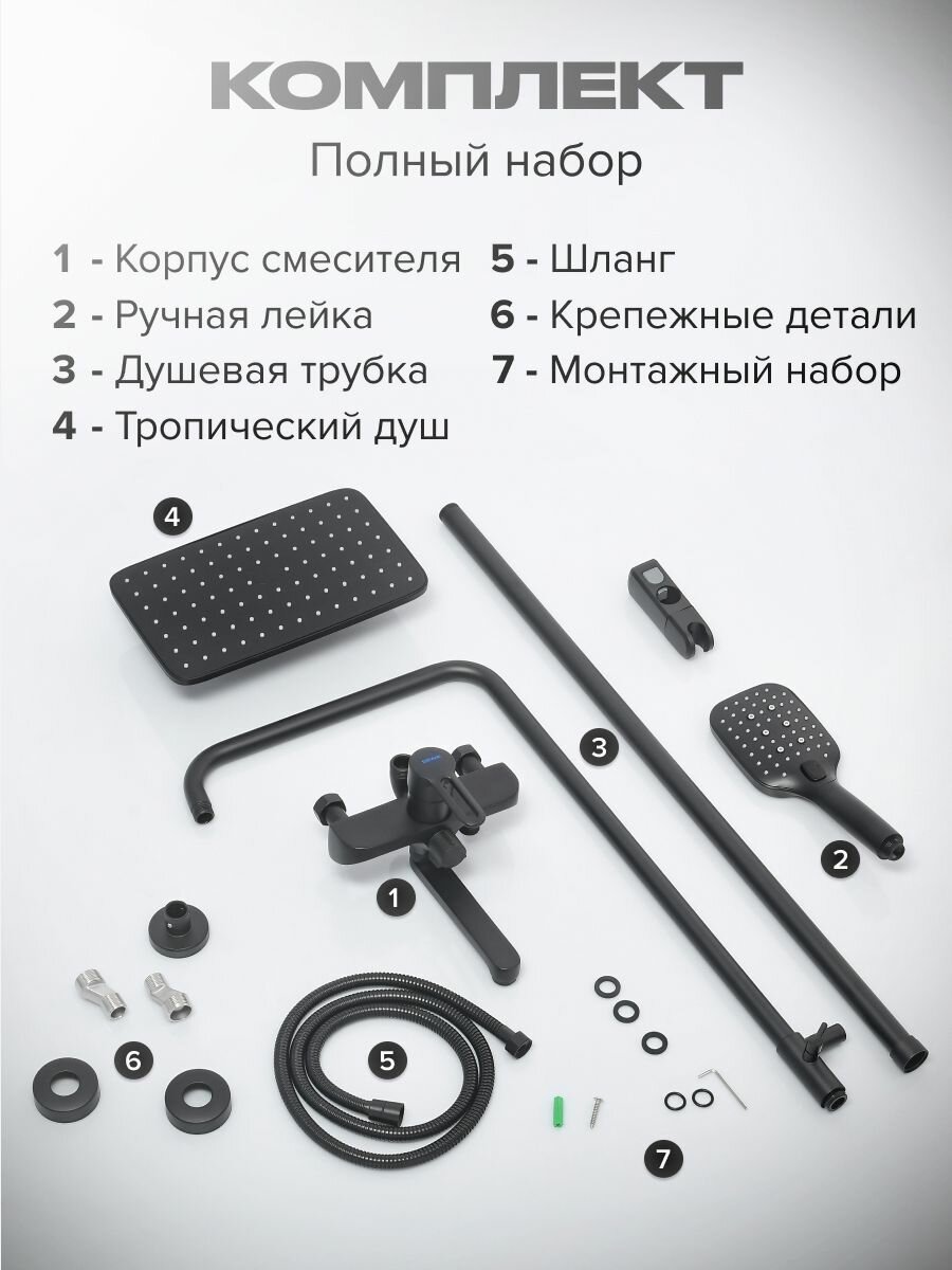 | Комплектация | верхний душ / излив для набора воды / ручной душ |