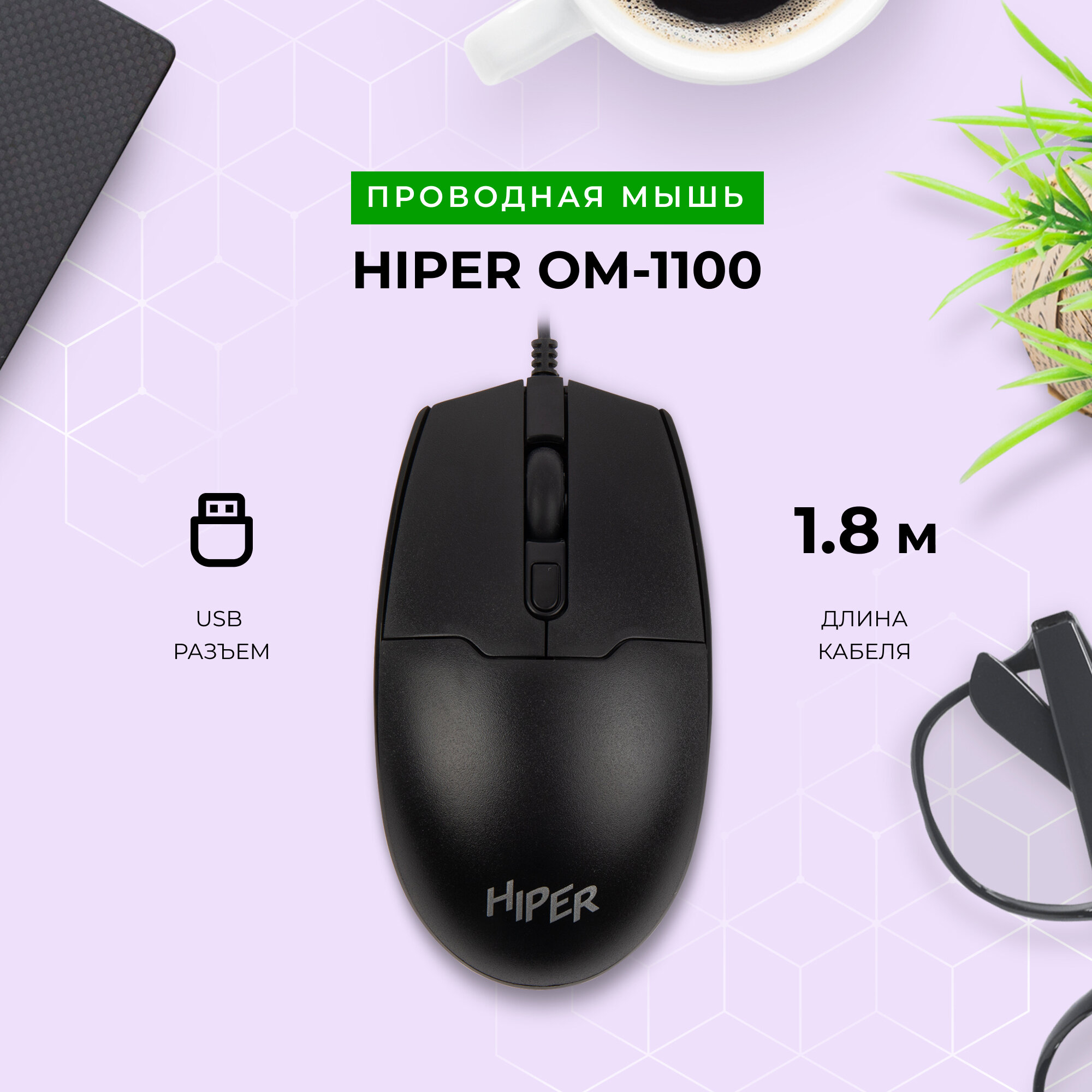 Мышь компьютерная Hiper OM-1100 черная, 1600DPi, 125Гц, проводная