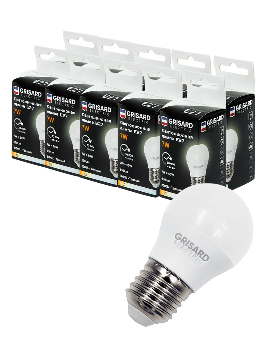 Лампа светодиодная GRISARD ELECTRIC шар G45 E27 7Вт 3000К 220В 10 штук интересное:
