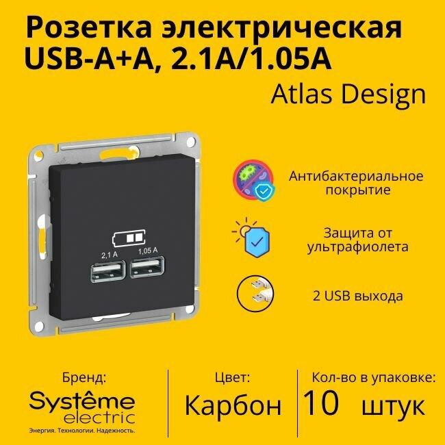 1 шт. Systeme Electric AtlasDesign Базальт Розетка USB A+A, 5В/2,1 А, 2х5В/1,05 А, механизм, ATN001433