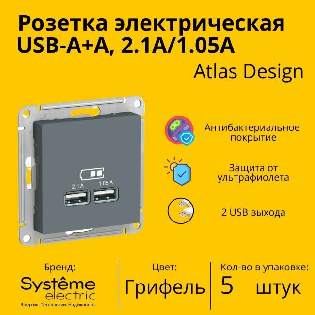 1 шт. Systeme Electric AtlasDesign Базальт Розетка USB A+A, 5В/2,1 А, 2х5В/1,05 А, механизм, ATN001433