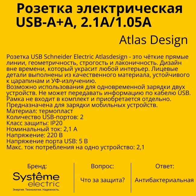 Розетка USB Systeme Electric (schneider Electric) SCHNEIDER ELECTRIC ATLASDESIGN 5В/2,1 А, 2х5В/1,05 А, механизм, Белый, ATN000133