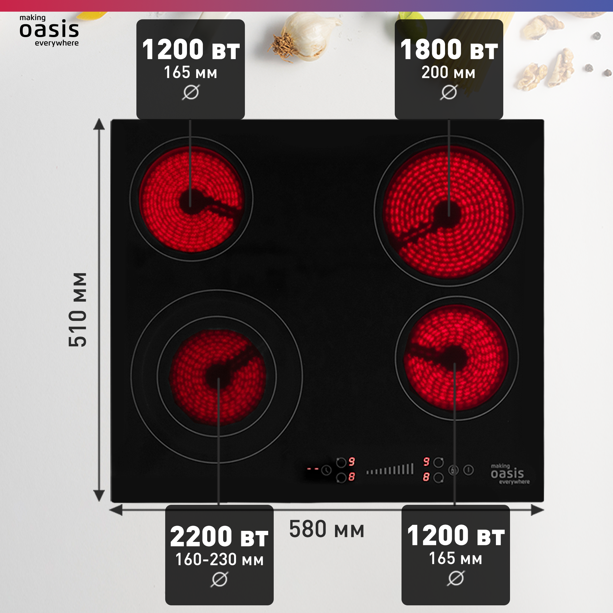 Электрическая варочная панель Oasis P-SB, ширина 58 см, стеклокерамика, 4 конфорки, 6400 Вт