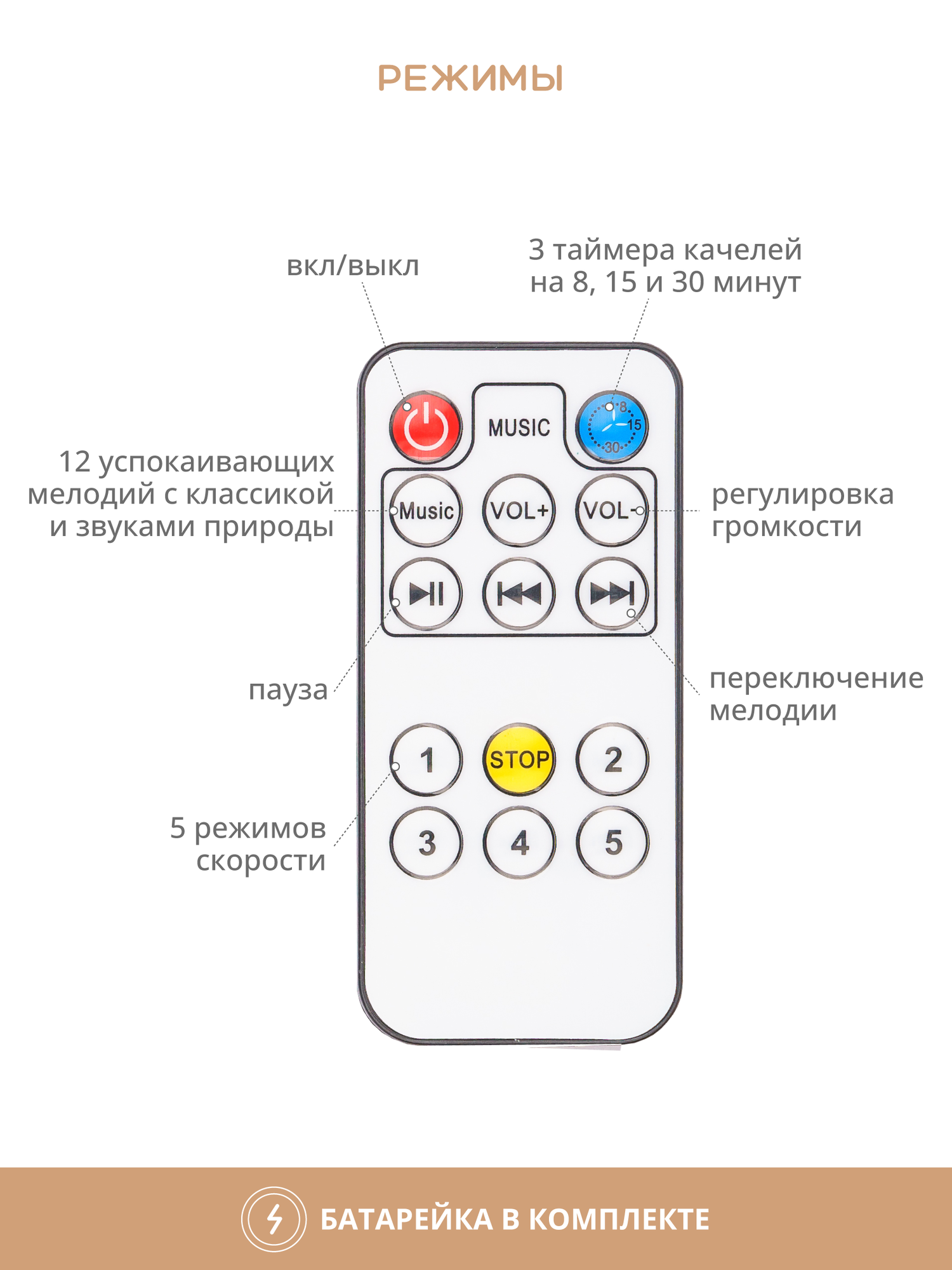 | Особенности | пульт ДУ / работа от батареек / таймер музыки / таймер укачивания |