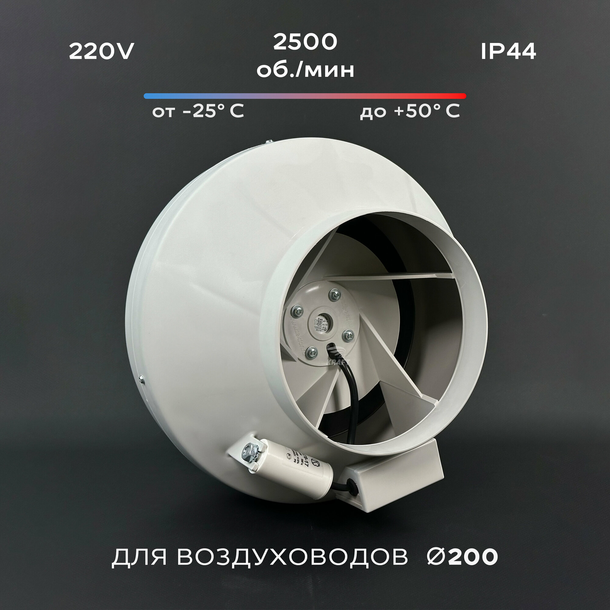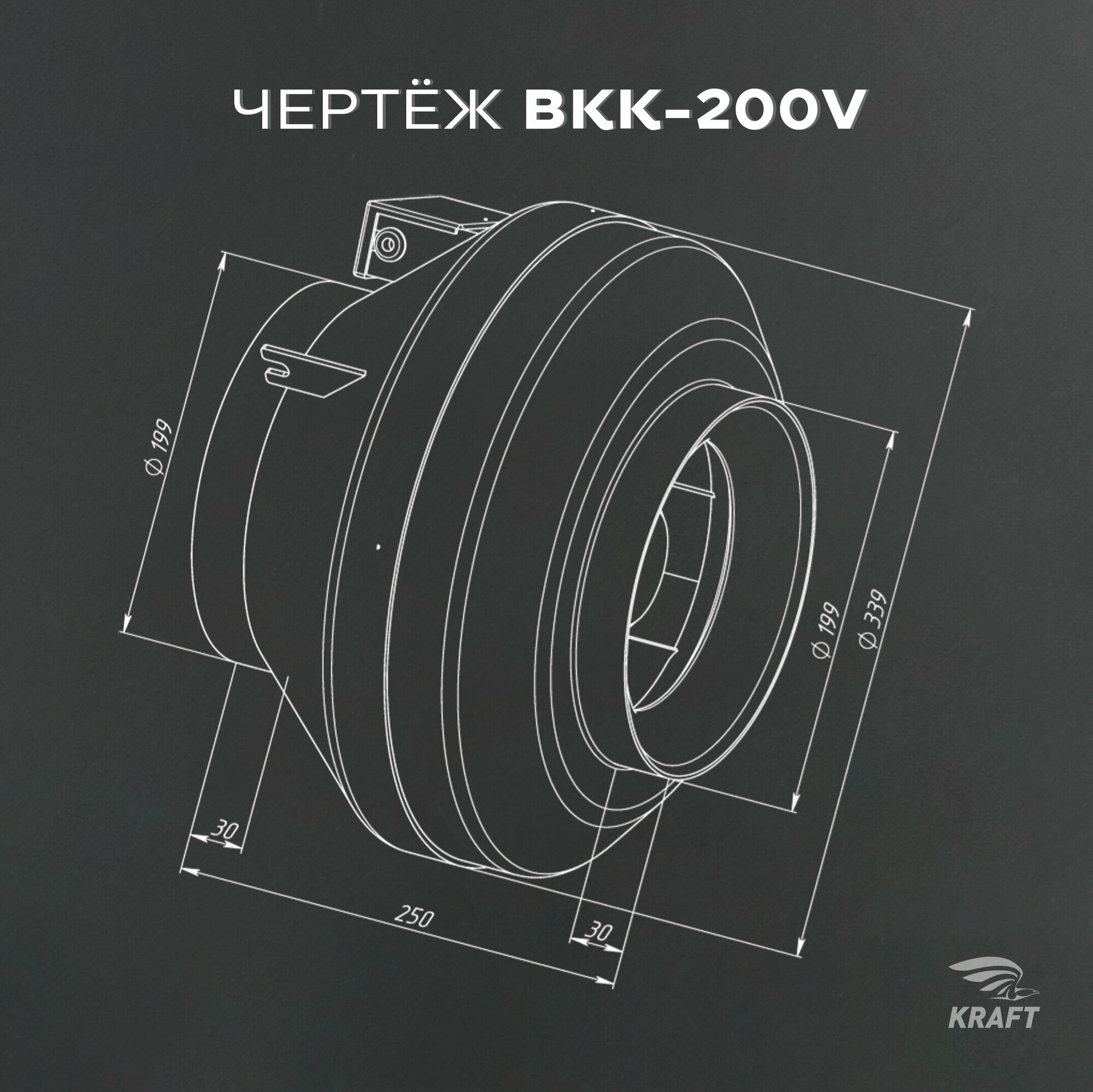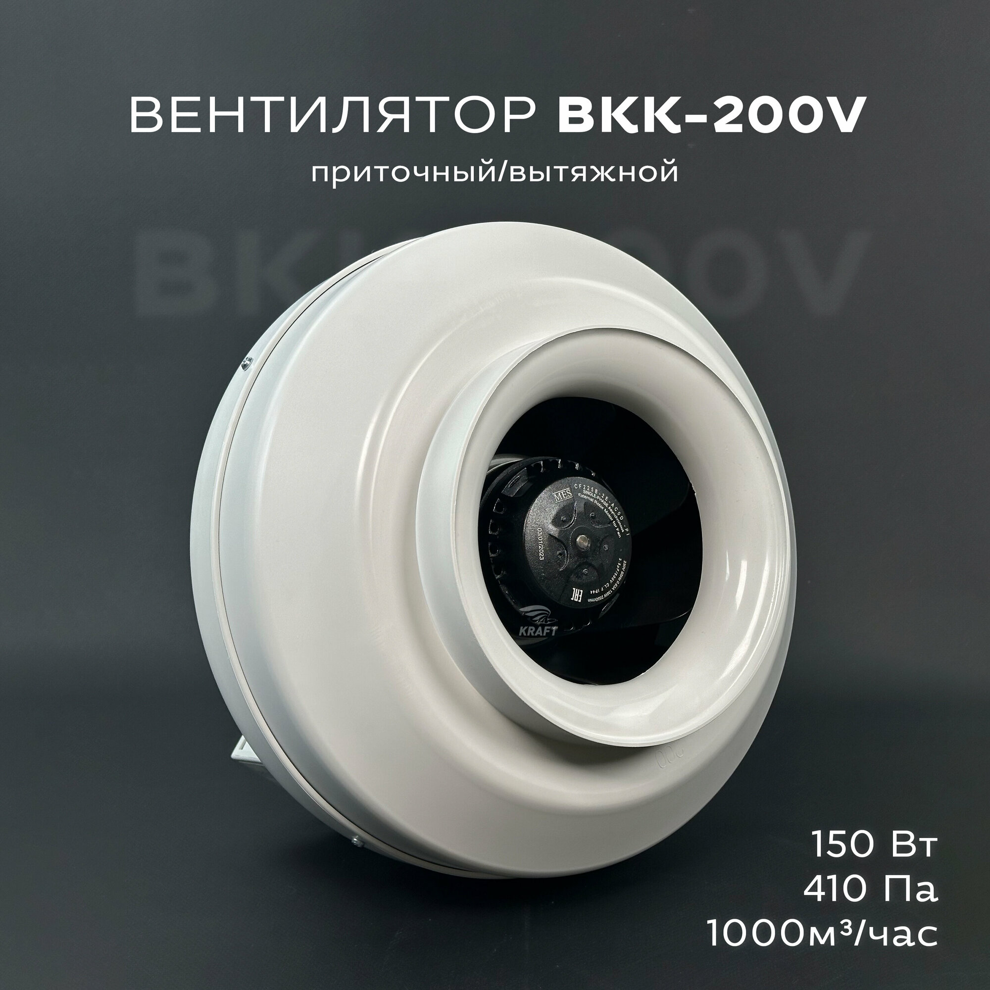 Вентилятор канальный круглый ВКК-200 V, 220В, 1000 м3 в час, 410 Па, 104 Вт, IP 44 для круглых воздуховодов диаметром 200 мм, вытяжной или приточный