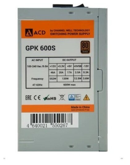 Блок питания ATX Gpk600s (gpk-600s) ACD by CWT GPK 600W, 80+ Bronze, 120mm Fan, Pcie 6+2PIN*2, RTL .