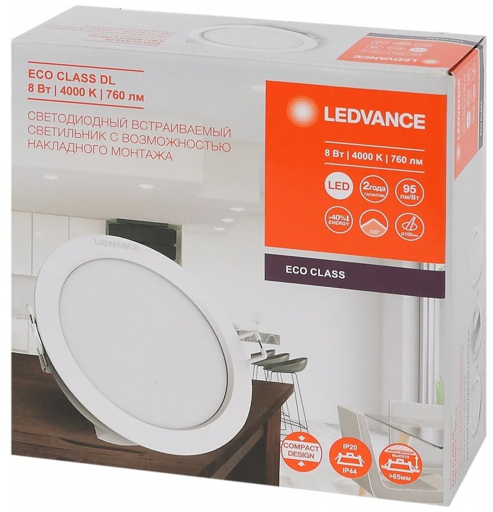 LEDVANCE Светильник светодиодный даунлайт ECOCLASS DL8W 840 WTIP44 10x1RETRU LEDV 4058075656611