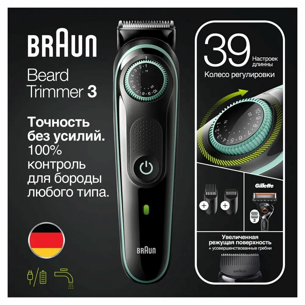 Триммер для бороды и головы Braun BT3341, беспроводной, с 2 насадками + Мужская бритва Gillette Fusion ProGlide, Германия