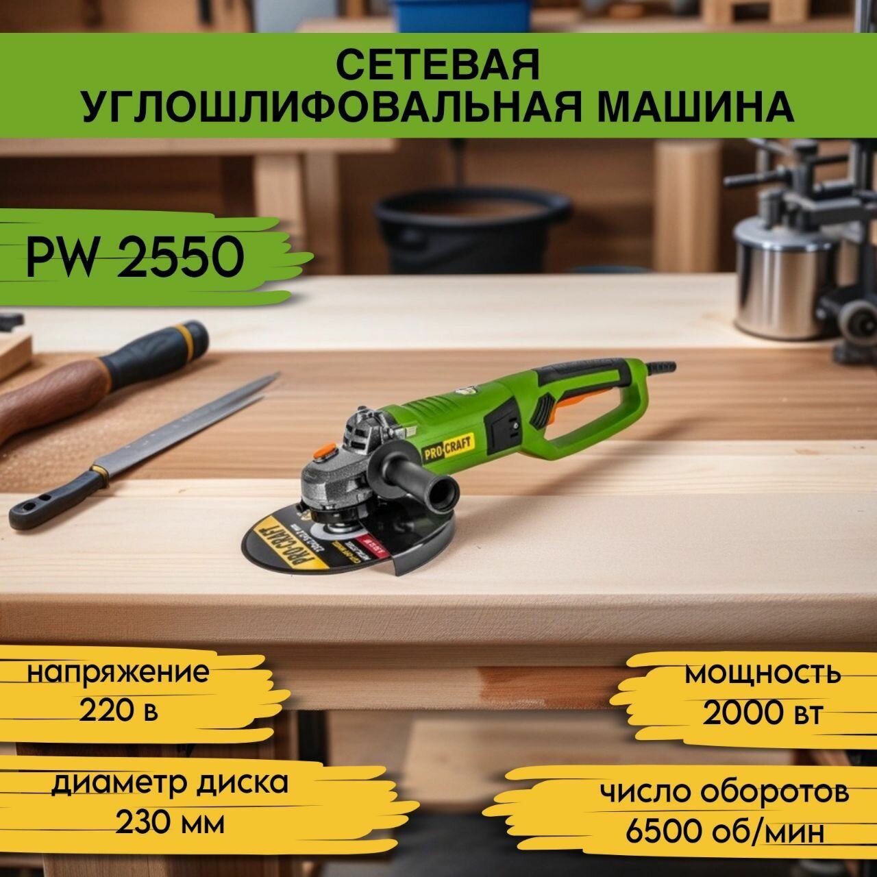 Углошлифовальная машина болгарка Procraft PW 2550, 230мм круг, 2550Вт, 6500об/мин