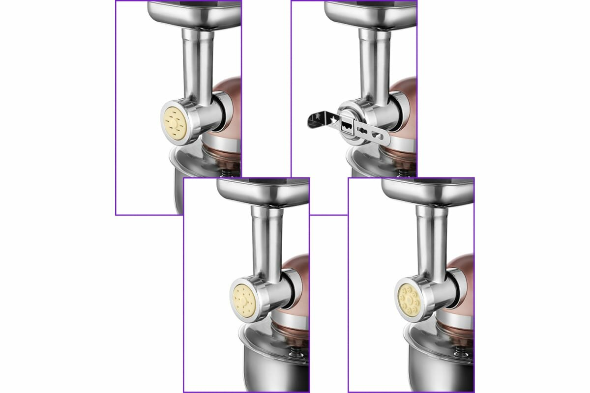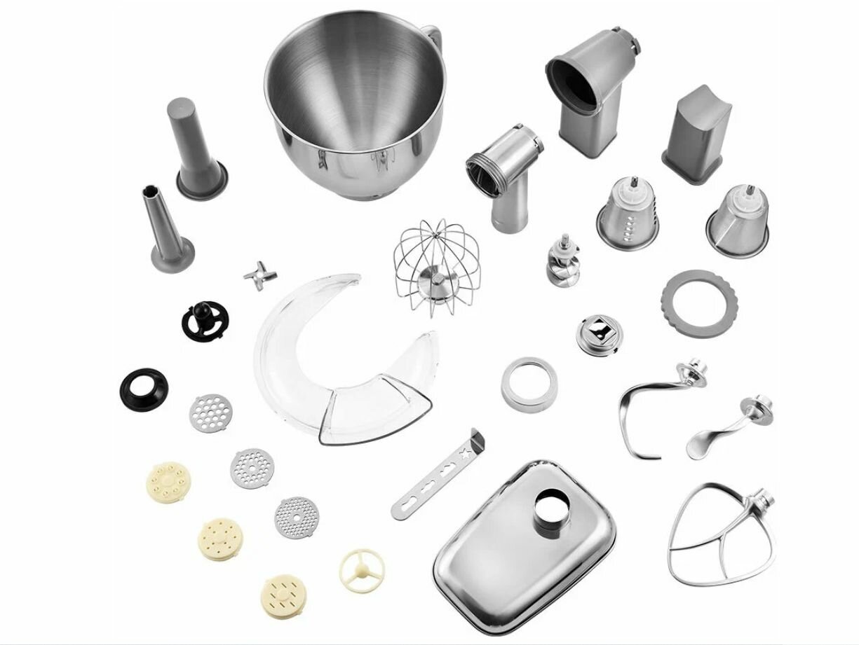 | Дополнительная информация | Комплектация 1. Моторный блок — 1 шт. 2. Чаша миксера — 1 шт. 3. Крышка чаши миксера — 1 шт. 4. Венчик для взбивания — 1 шт. 5. Насадка для смешивания — 1 шт. 6. Крюк для замешивания теста — 2 шт. (маленький + большой) 7. Мясорубка — 1 компл.: • Загрузочный блок мясорубки — 1 шт. • Кольцевая гайка мясорубки — 1 шт. • Загрузочный лоток — 1 шт. • Толкатель — 1 шт. • Шнек — 1 шт. • Нож — 1 шт. • Решетка с мелкими отверстиями (3 мм) — 1 шт. • Решетка со средними отверстиями (5 мм) — 1 шт. • Решетка с крупными отверстиями (7 мм) — 1 шт. • Насадка для колбас 1 — 1 шт. • Насадка для колбас 2 — 1 шт. • Насадка для кеббе — 1 шт. • Крышка насадки для кеббе — 1 шт. • Насадка для печенья — 1 шт. • Насадка для спагетти — 1 шт. • Насадка для макарон — 1 шт. • Насадка для тальятелле — 1 шт. 8. Терка — 1 компл.: • Загрузочный блок терки— 1 шт. • Кольцевая гайка терки — 1 шт. • Толкатель — 1 шт. • Терка (нож) — 1 шт. • Шинковка (нож) — 1 шт. 9. Руководство по эксплуатации — 1 шт. 10. Коллекционный магнит — 1 шт.* *опционально |