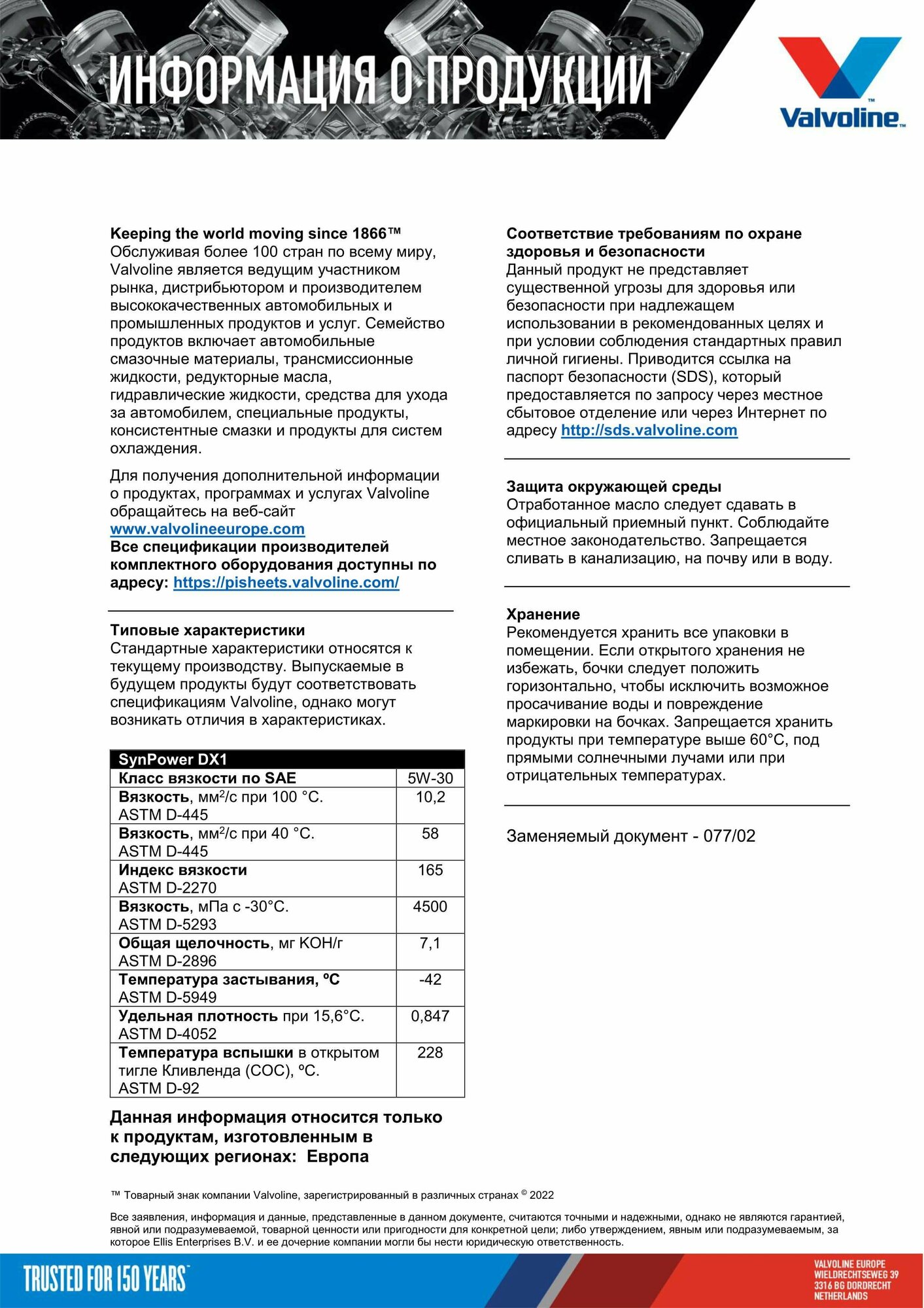 СохранитьValvoline SynPower DX1 5W30 интересное: