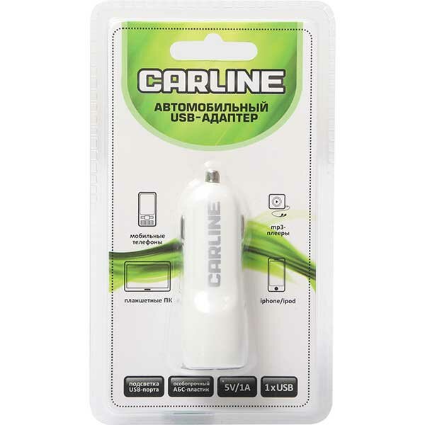Адаптер автомобильный CARLINE 1хUSB 1А в прикуриватель 12/24В, цвет белый, упаковка запаянный блистер.