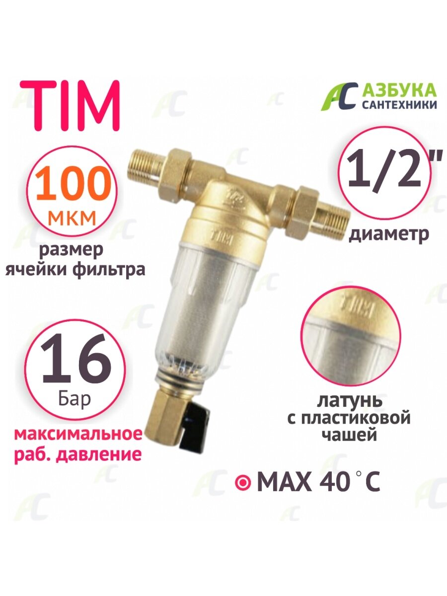 Tim Фильтр магистральный 1/2" без манометра, промывной (хол) TIM 1004