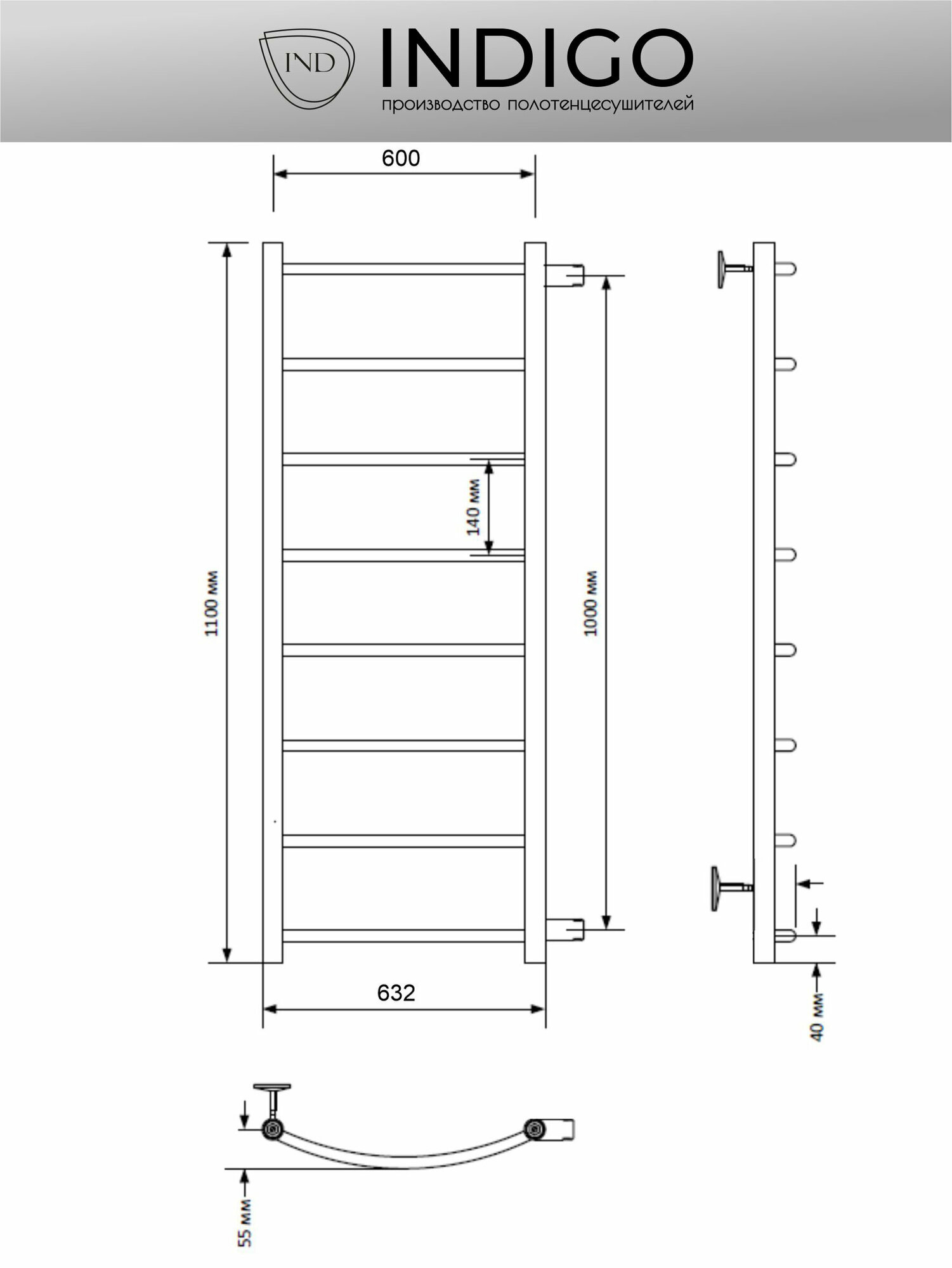 Полотенцесушитель INDIGO Arc 1" - 1/2 110/60, м/о 100 см, бок.подкл. LASW110-60-б/п-100