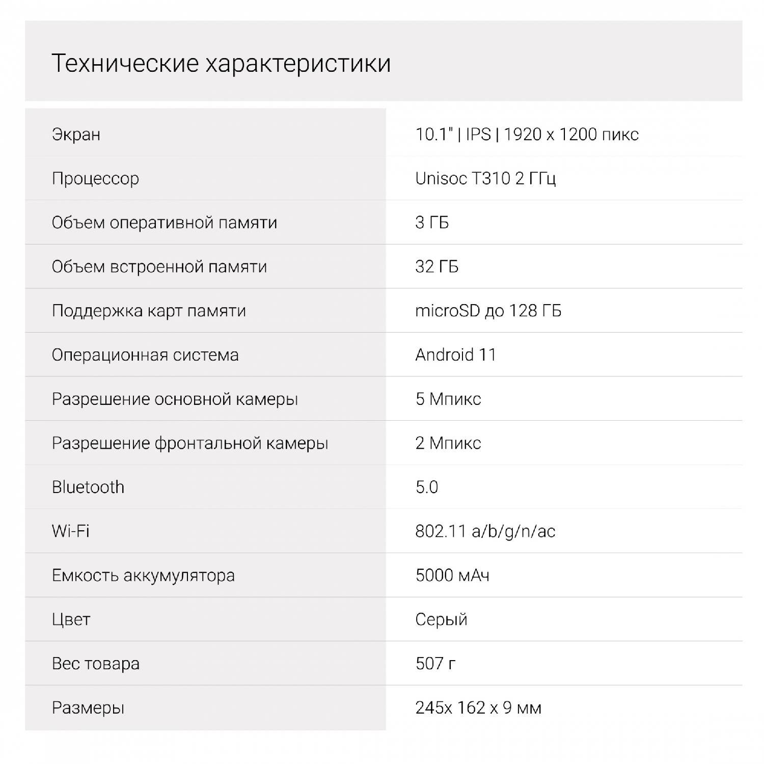 | Плюсы: | Бюджетный планшет с 4G-поддержкой. Он оснащен Android 11, 3 ГБ оперативной памяти и 32 ГБ встроенной памяти, которую можно расширить до 128 ГБ с помощью карты microSD. Дисплей 10,1 дюйма имеет хорошую четкость и яркость. Камеры на 5 Мп и 2 Мп позволяют делать фотографии и видео, а также проводить видеовызовы. Он также имеет встроенный GPS-приемник. |