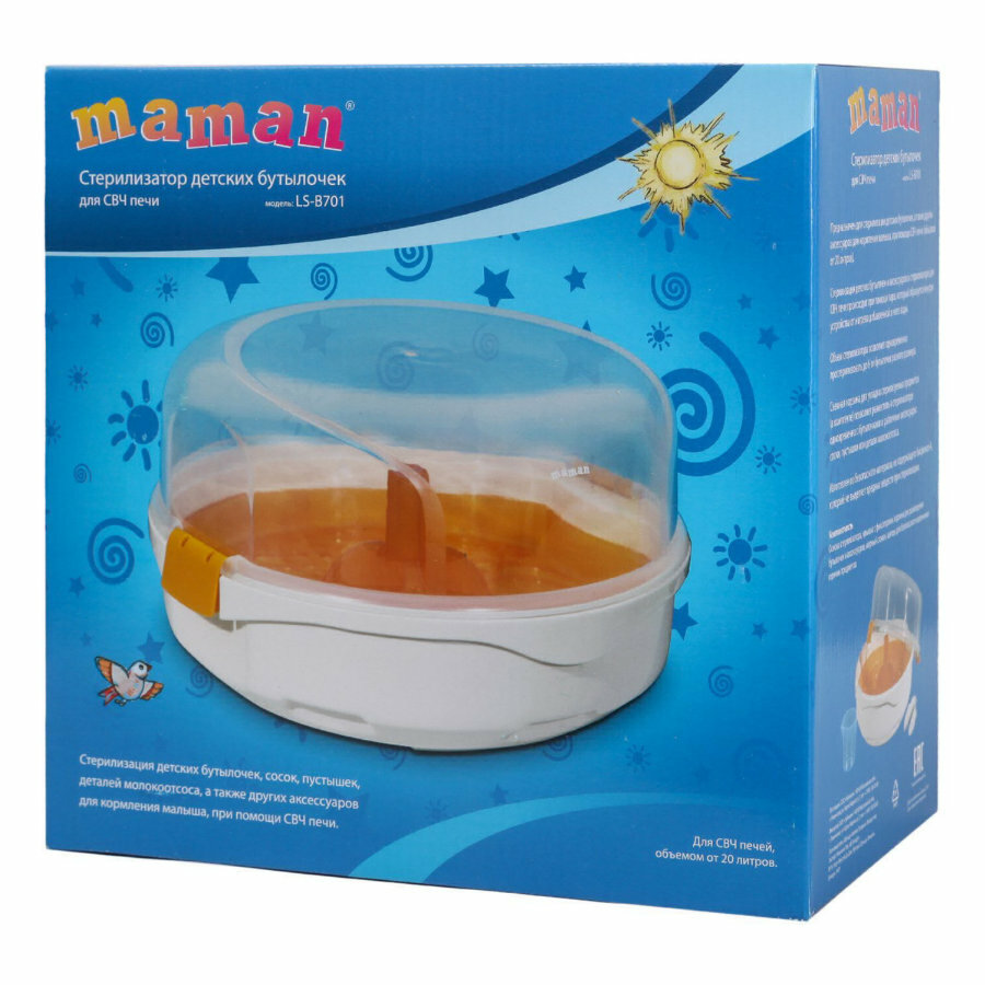 Ниже Вы можете прочитать отзывы на Стерилизатор Maman детских бутылочек для СВЧ печи LS-B701, ознакомится с подробными характеристиками, посмотреть интересные обзоры и фотографии на Стерилизатор Maman детских бутылочек для СВЧ печи LS-B701.