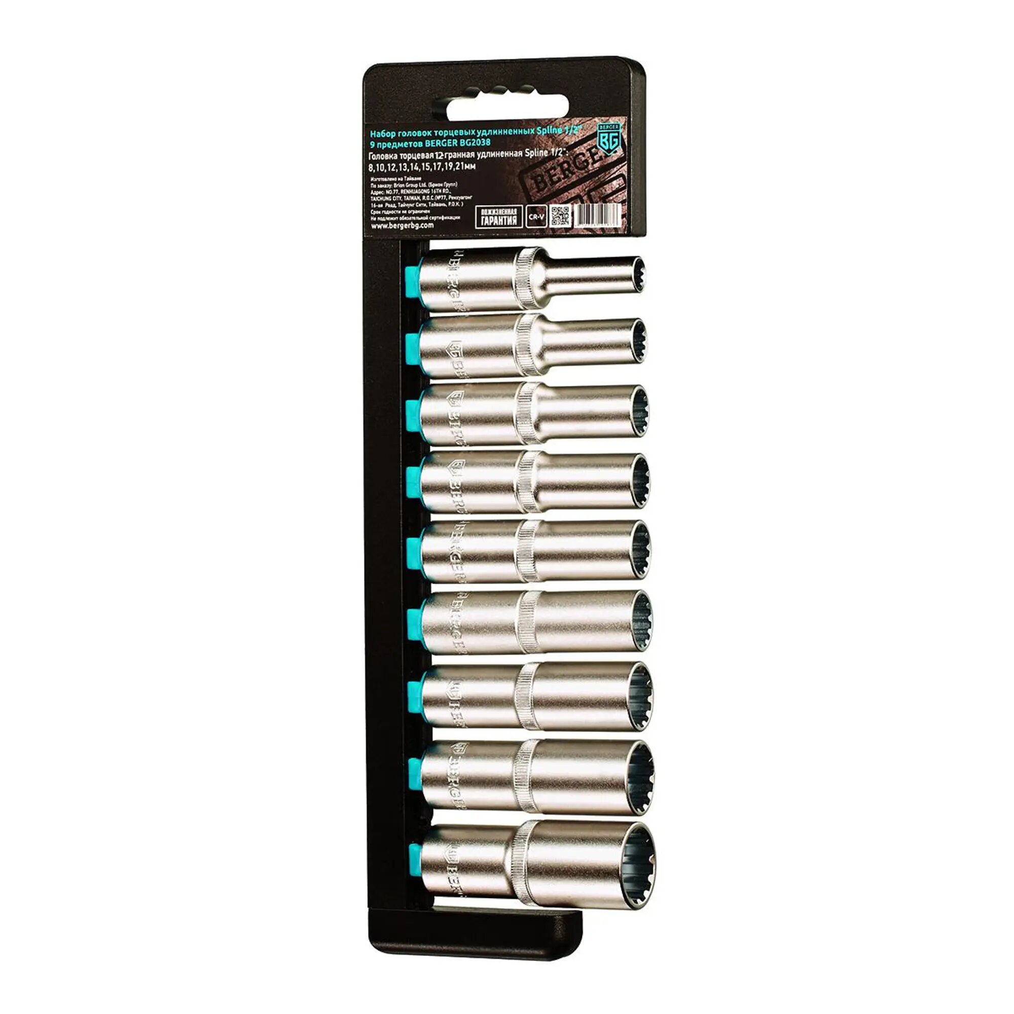 Набор головок торцевых удлиненных BERGER BG2038 1/2" Spline 9 предметов (8-21мм) подвес