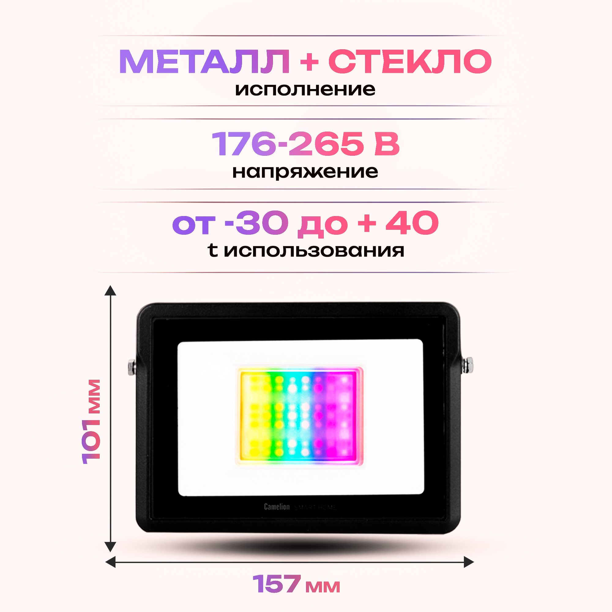 | Дополнительная информация | Управление через приложение на смартфоне: Camelion Smart Home (доступно в App Store, Google Play) , Голосовое управление: Siri, Алиса, Google, Маруся, Alexa |